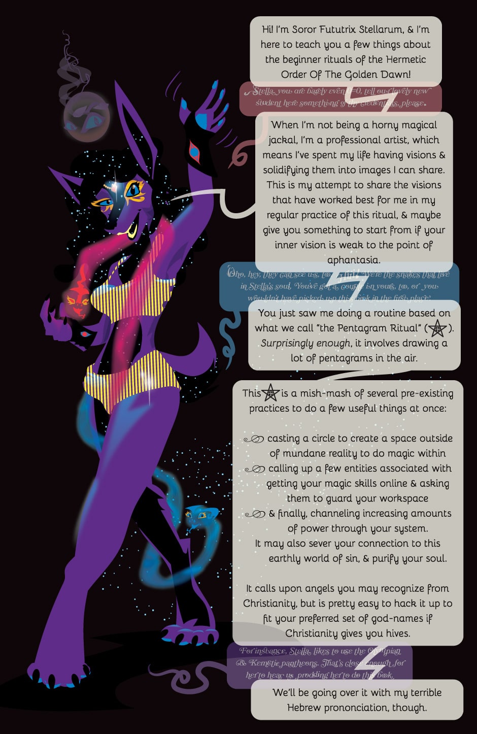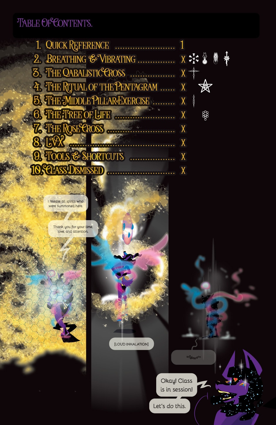 In about eighty pages of art and diagrams, Soror Fututrix Stellarum will show you the basic rituals of the famous Hermetic Order of the Golden Dawn, an influential set of 19th-century magicians who trained Aleistar Crowley... and she’ll also slip in some important words on how to breathe.