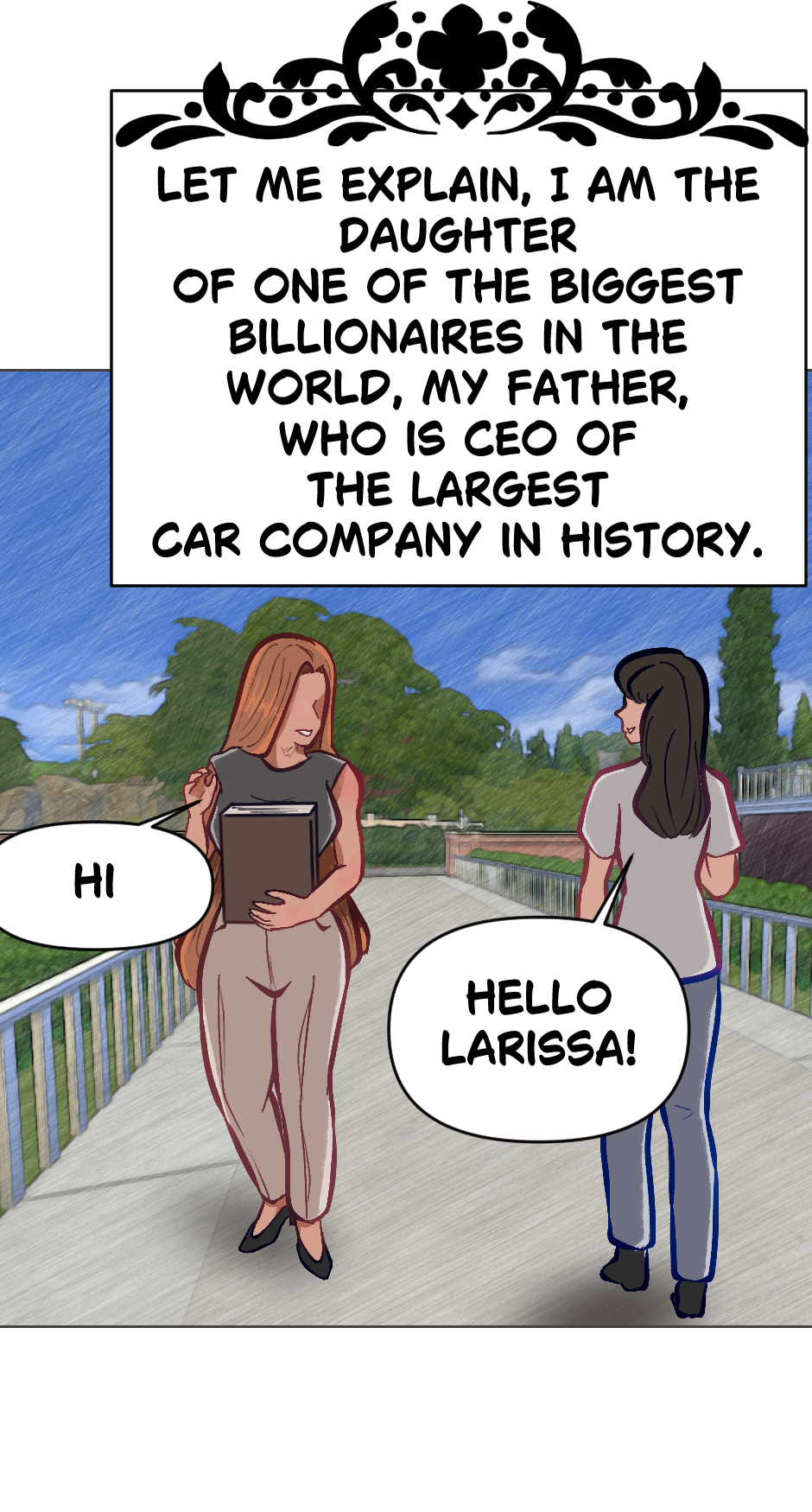 When you least expect it, you start to like your rival. Larissa is a confident girl and somewhat cold to some people, while Kaida is the opposite. Larissa doesn't like Kaida for the fact that she is #1 in college, and since she is competitive and has something pending with her father, her goal is to be #1.