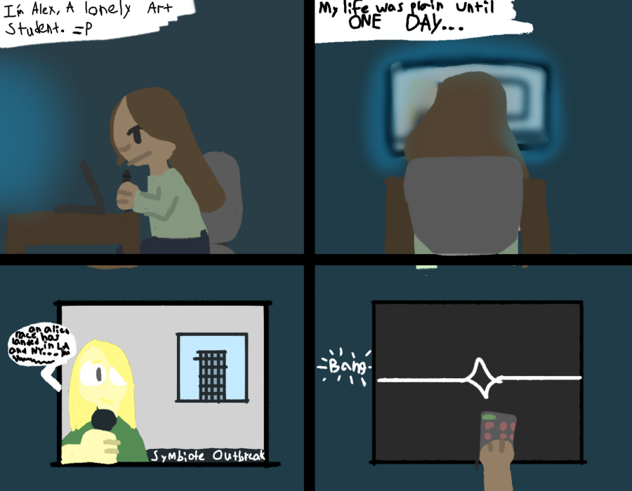 Transcript: I'm Alex, a lonely art student :P My life was plain, Until one day.. Tv: An odd alien race is being studied at Thrive institute, But some have broken out. Here's how to keep safe... Symbiote Outbreak *Bang*