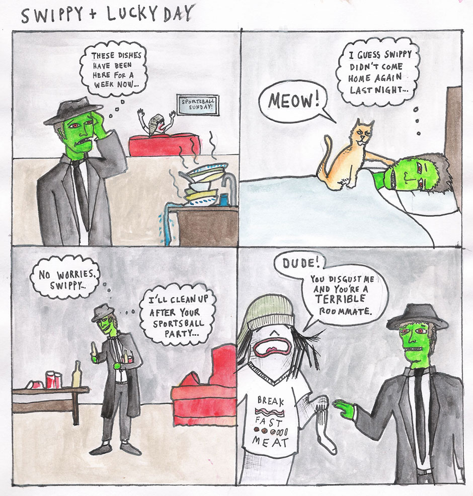 Living with roommates can be tasking. Lucky Day grins and bears it... Swippy on the other hand...