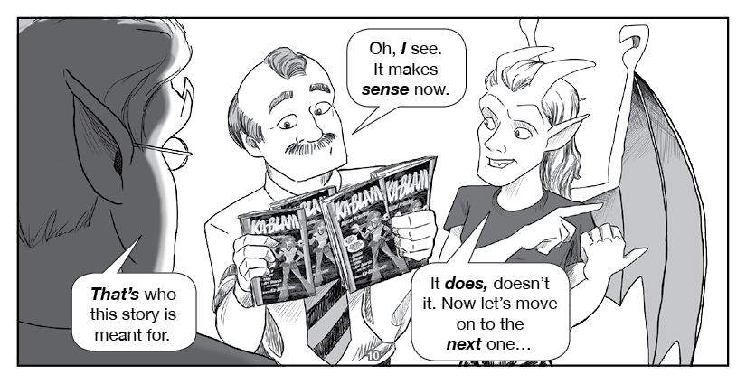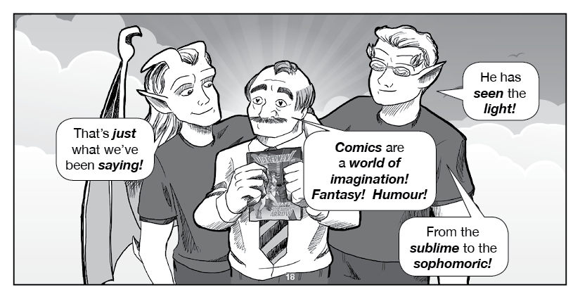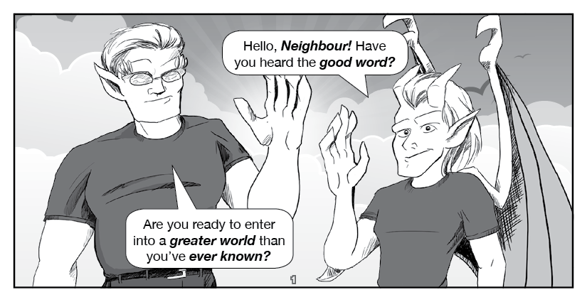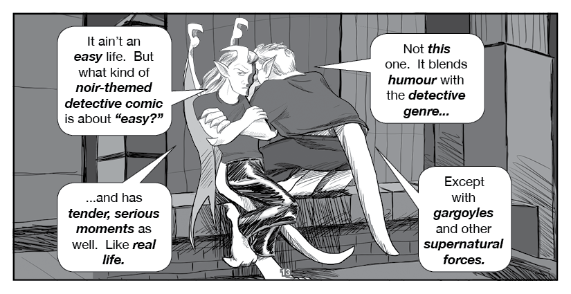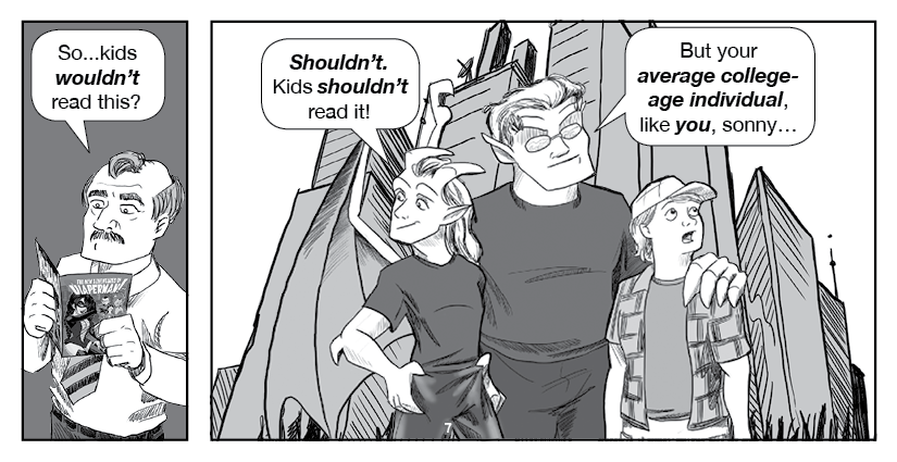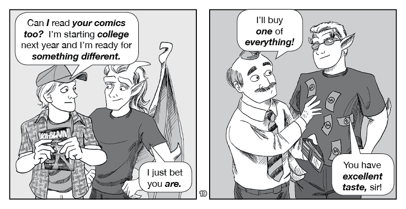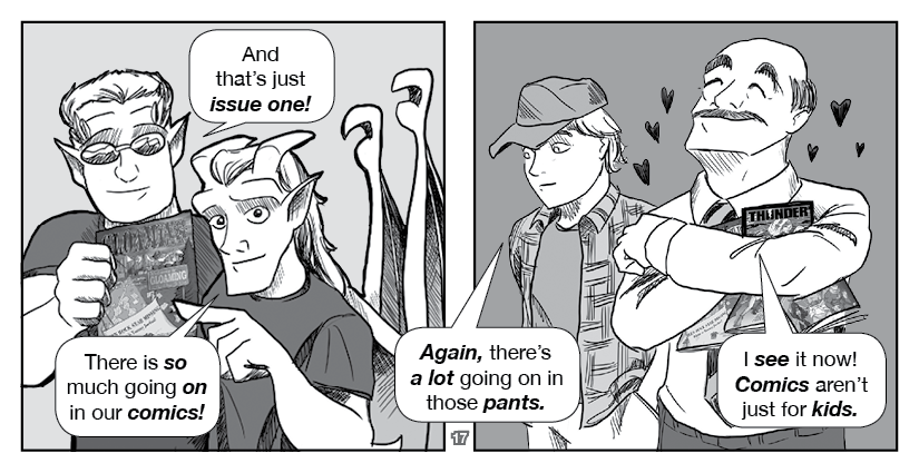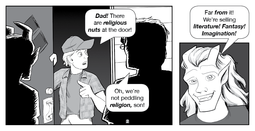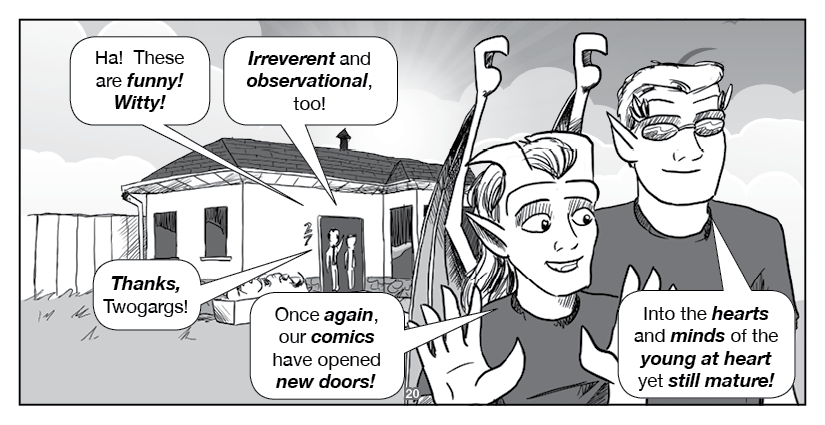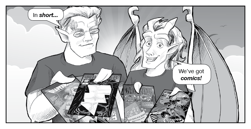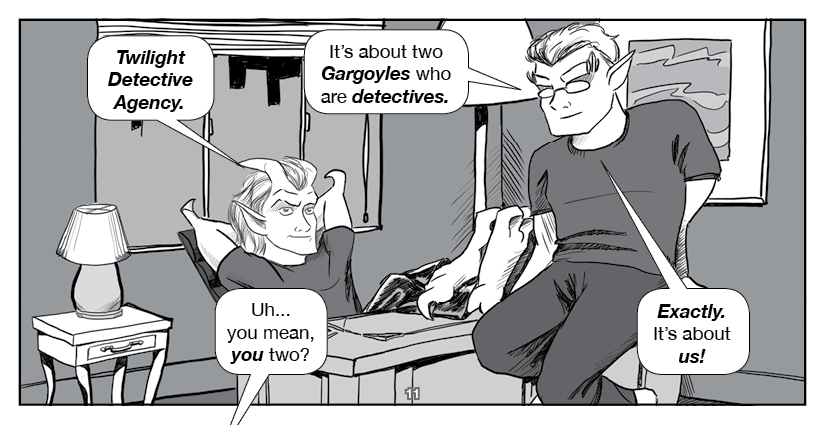 Hawkstone and Riverdale, the titular Two Gargoyles, visit an ordinary home to spread the Good Word... about indie comics!