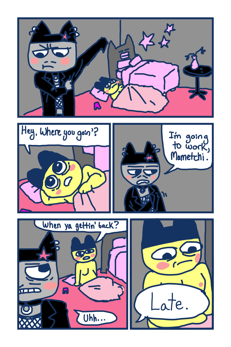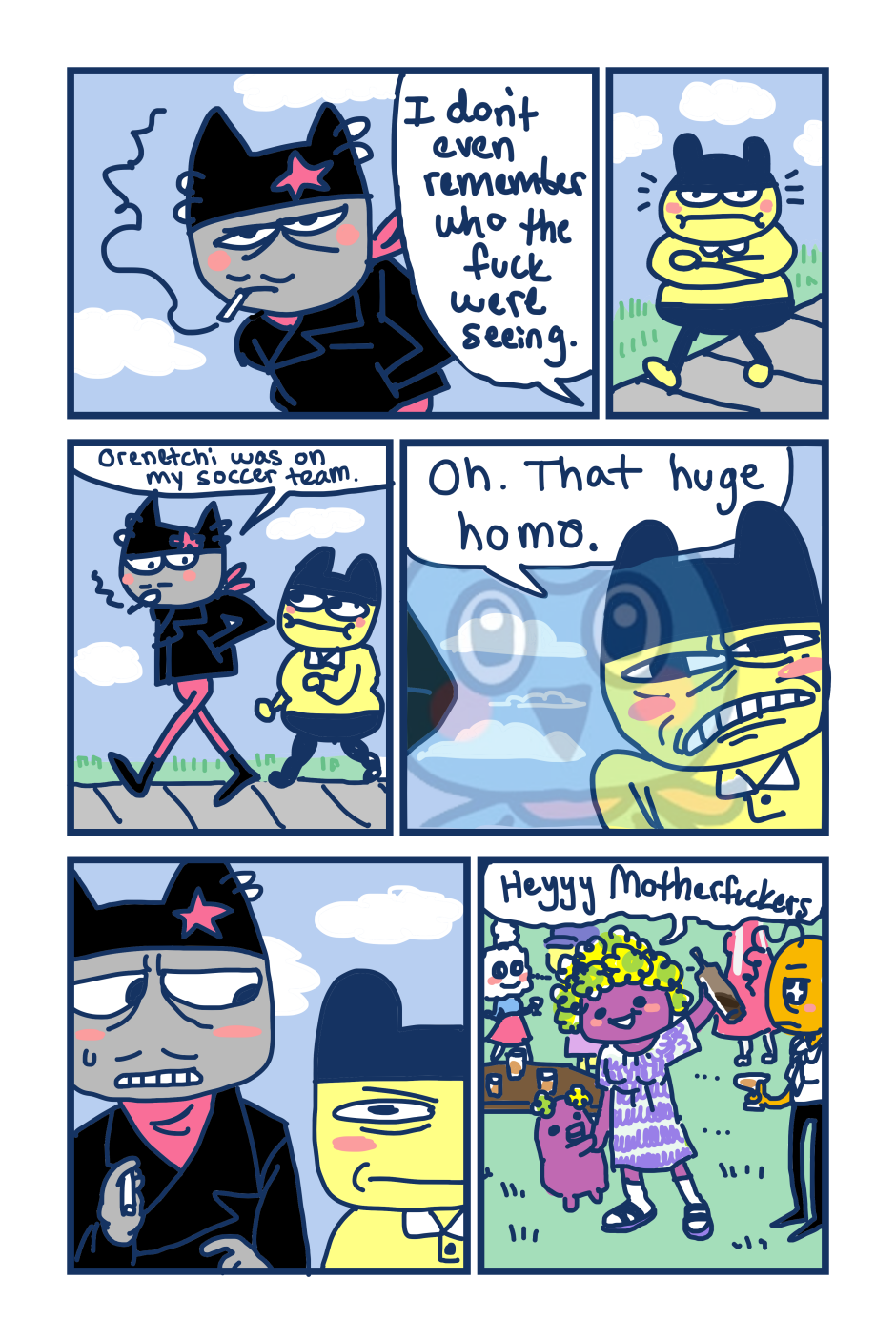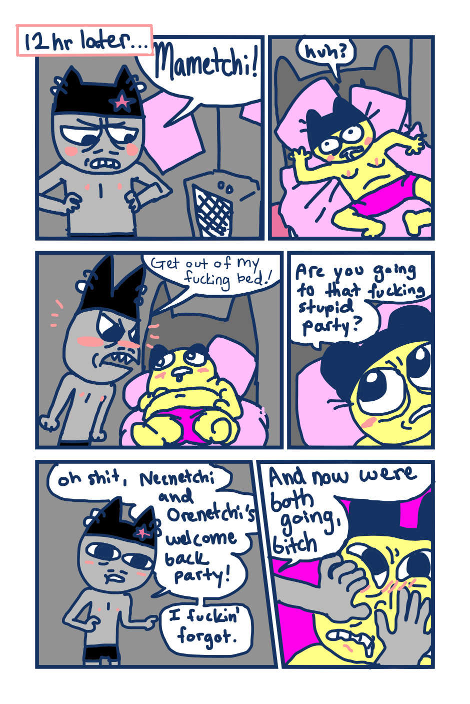 A fancomic/parody for the Tamagotchi series by Bandai. This story follows Mametchi and Kuromametchi 10 years after their prime time. Mametchi finds himself at a dead end in life. He sleeps on Kuromametchi's floor and has no job or money. Kuromametchi is tired of living with Mametchi, who is openly homophobic, but feels bad for his old friend. This story follows Mametchi as he tries to become a decent person and mend his broken relationships.