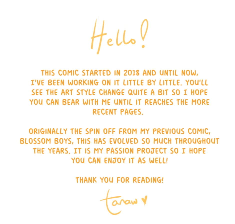 Hello everyone! It's wild that I've been chipping away at this comic since 2018. I've decided to upload it here as Tapas is where I've posted my first webcomic and I really enjoyed my experience here ; o ; <3 Thank you for reading and I hope you enjoy!