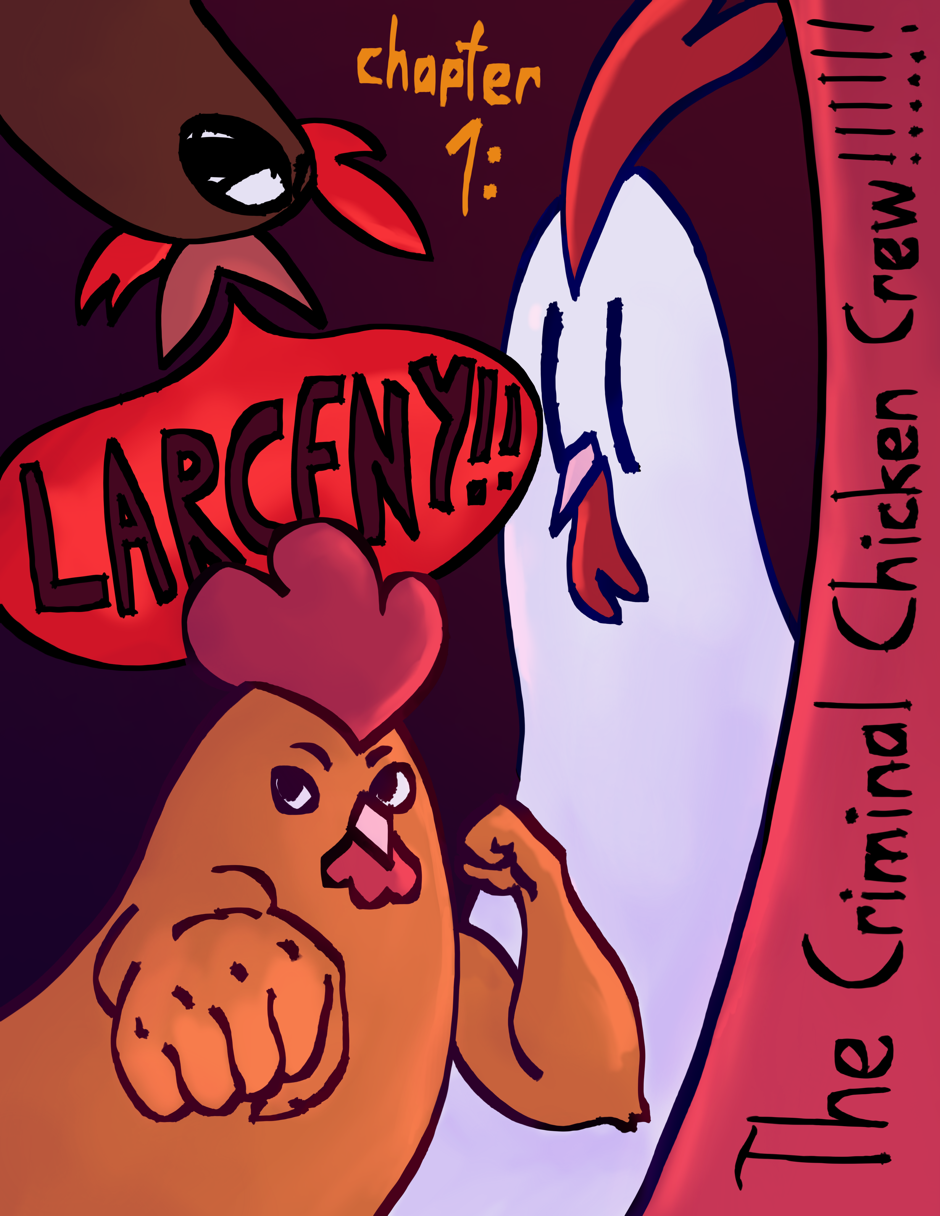 A silly comic about 3 magical chickens who do crime! Their names are Choik, Chuck, and Chipper, and they will not let anyone stop them from engaging in criminal shenanigans. The threat of being caught by the humans is constantly looming over their heads, but they don't care about that! Choik can outwit them with his super-smart chicken brain, Chuck can kick their butts with his muscular legs, and Chipper can scream at them really loudly!