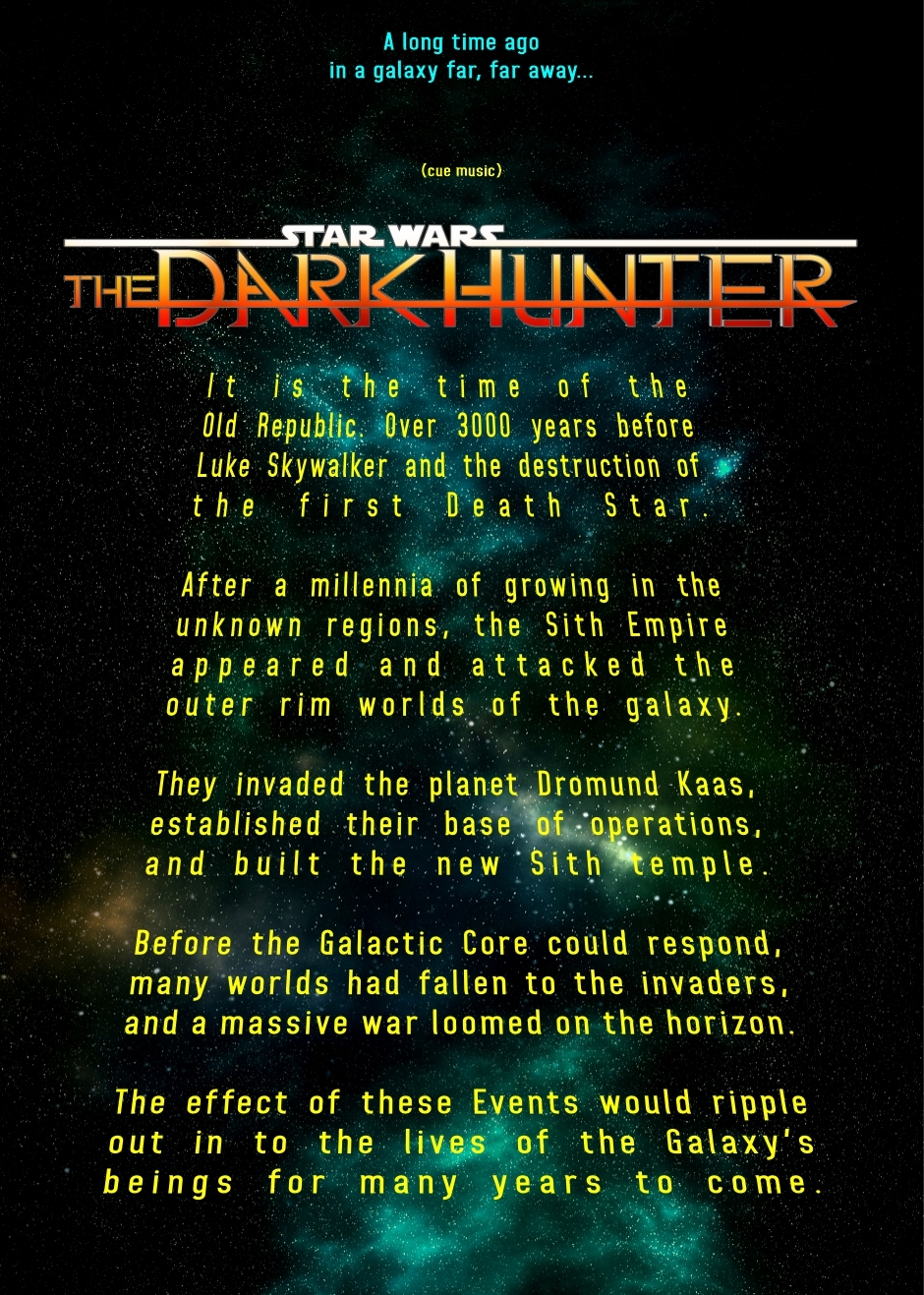 In this episode is the short history of the current galactic conflict and the origin of the Dark Hunter, Taris.