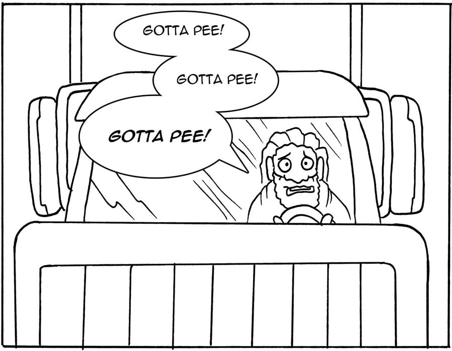Carl has found himself in a bit of a pickle. He's been driving for the past eight hours straight and his bladder is now telling him it's time to pull over to get some relief.