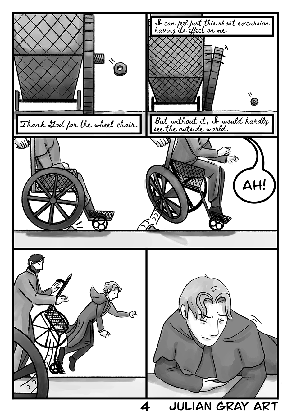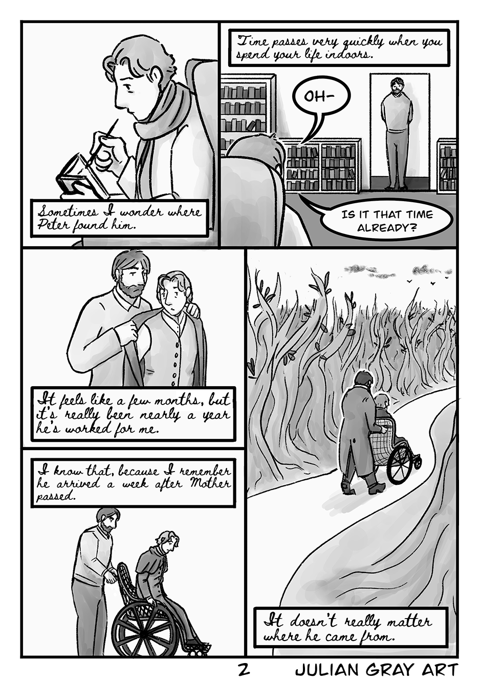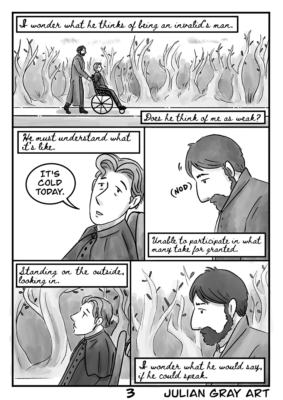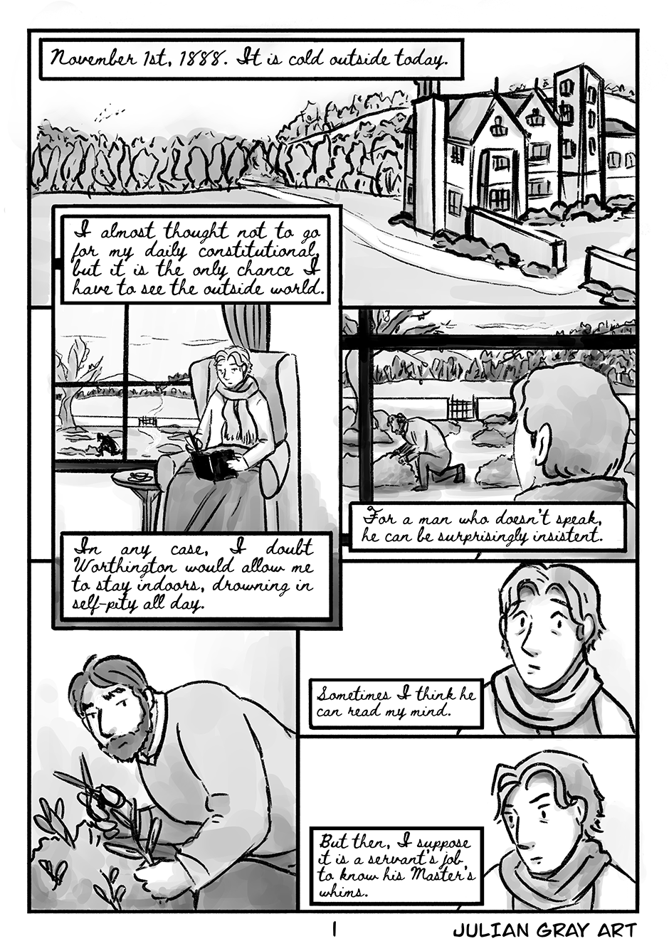 The Invalid’s Valet is a one-shot Victorian queer romance comic. Neurasthenia is the 19th century term for what is now known as Chronic Fatigue Syndrome/Myalgic Encephalopathy (CFS/ME), my own condition, and the comic was inspired by my own struggle with internalised ableism and depression. Please note there are themes of suicidal ideation in this comic.