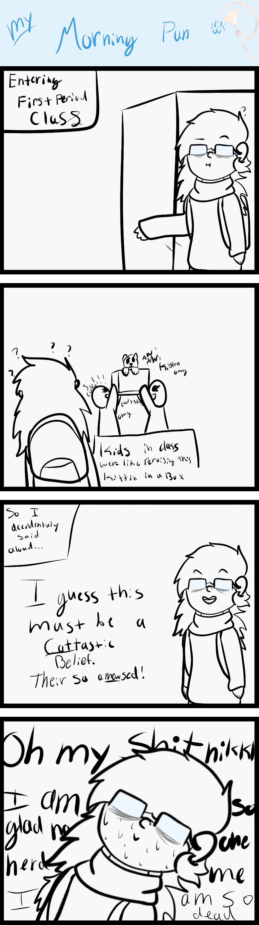 One time in class i walked in on kid around a kitten in a box and they seemed like they were like praising it so i made a pun i am still ashamed of ...