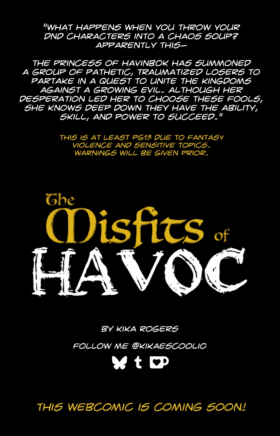 The Princess of Havinbok has summoned a group of pathetic, traumatized losers to partake in a quest to unite the kingdoms against a growing evil. Although her desperation led her to choose these fools, she knows deep down they have the ability, skill, and power to succeed.