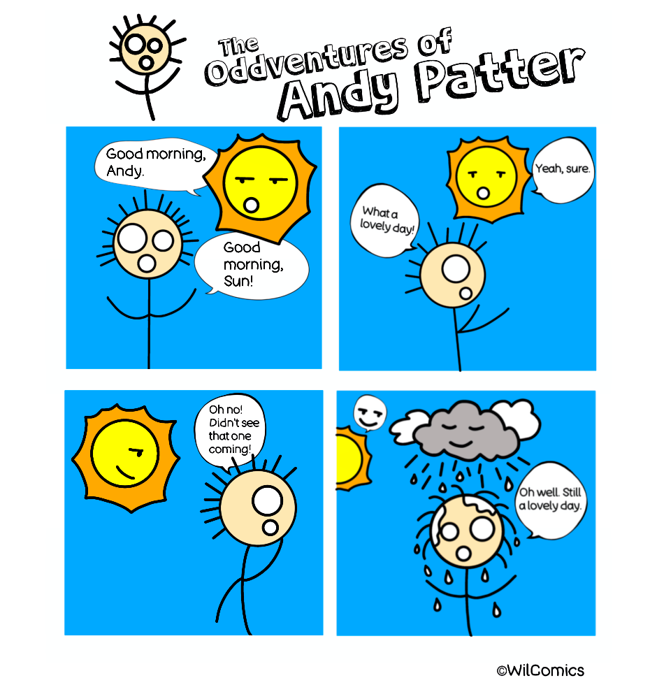 Get ready for a dose of delightfully absurd comedy with Andy Patter on his first Oddventur: Cloudy With A Chance of Andy! These four-panel comics deliver quick, quirky laughs as Andy encounters the oddities of his world, proving that even grumpy suns and sudden downpours can't dampen his spirits.