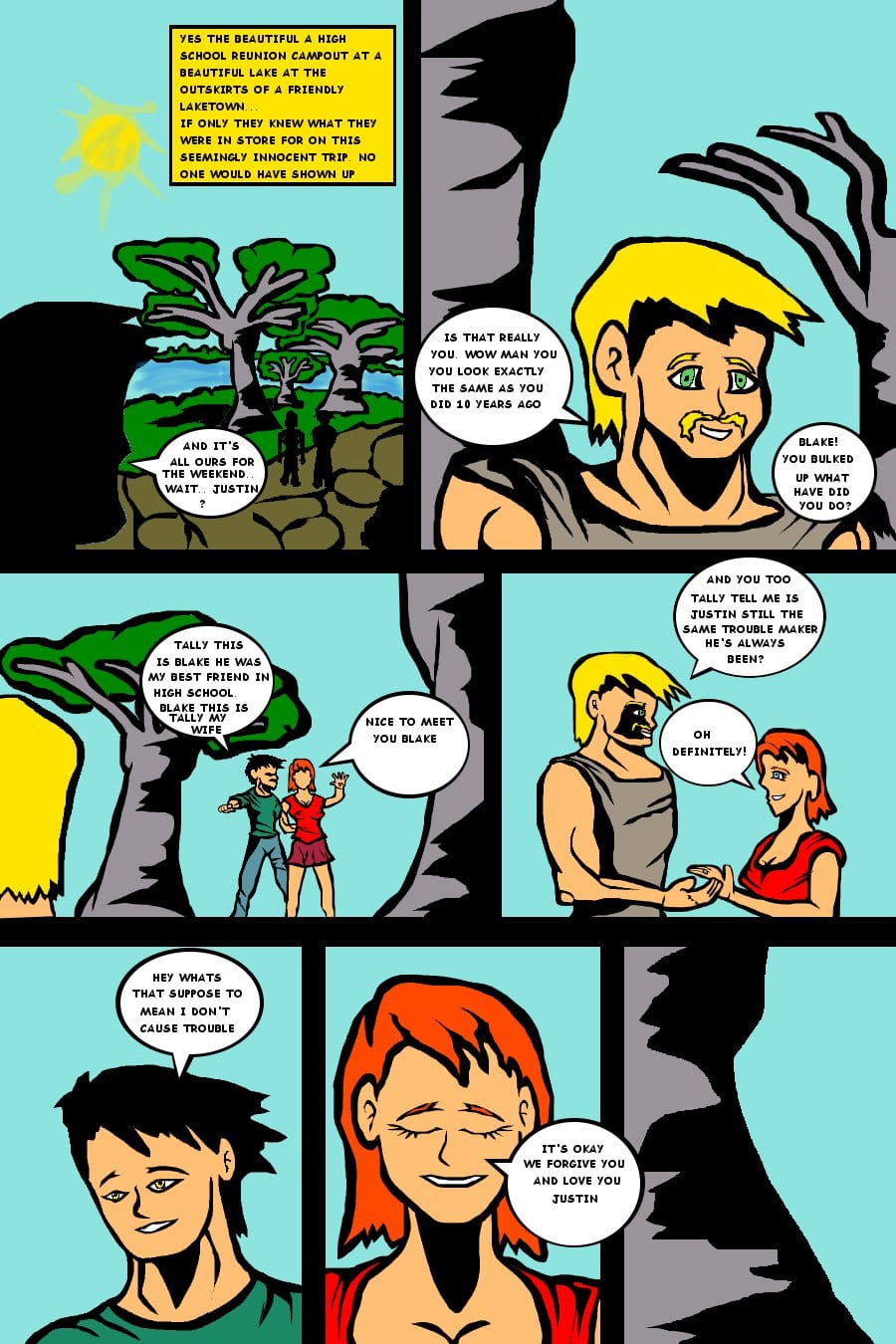 Welcome to the first episode of the new and improved Reunion. Our story begins with Tally and her husband Justin driving to justin's 10 year high school reunion. Being held at a lake town Summer camp the trip promises to be a fun filled weekend. until the a police deputy stops by with a warning
