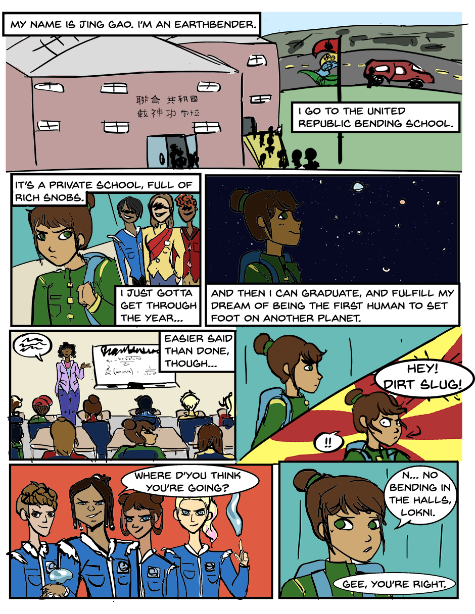 A fanmade Avatar comic, this comic picks up after the death of Avatar Korra and follows an earthbender named Jing Gao, who goes to a prestigious bending school in Republic City. Intending to graduate and become a renowned earthbending teacher, his plans are upended when he discovers he is the Avatar.