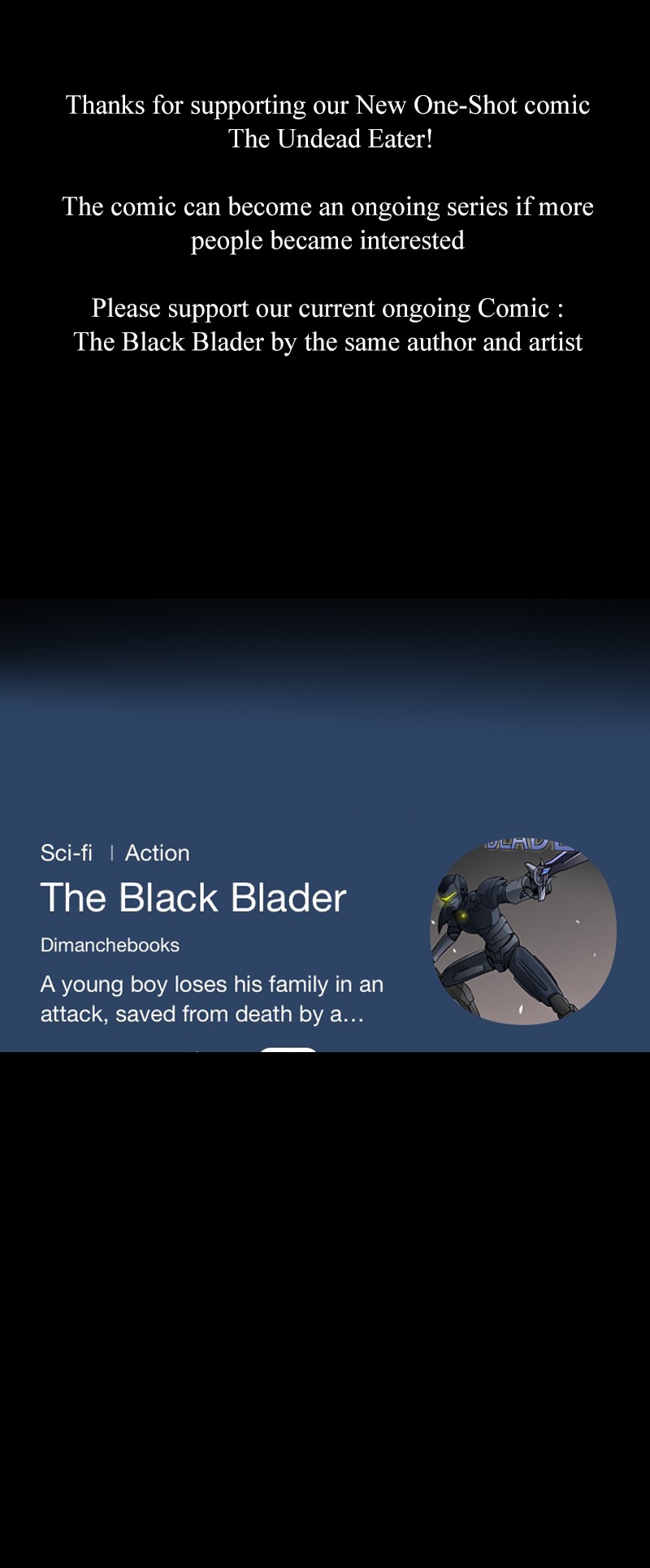 Hope you enjoyed yet another one of our one-shots comic, The Undead Eater can still become a comic series if it gets enough attention, Please support the writers and authors by following their social media and support our current ongoing comic : The Black Blader.