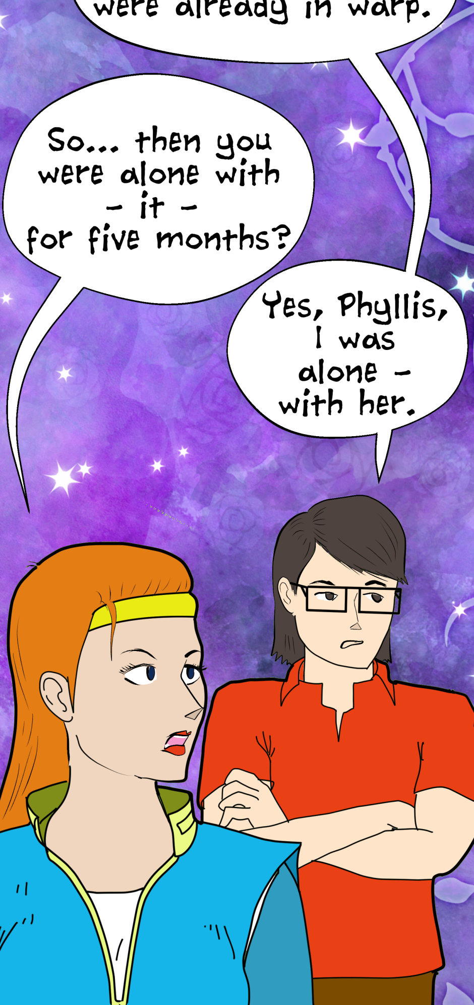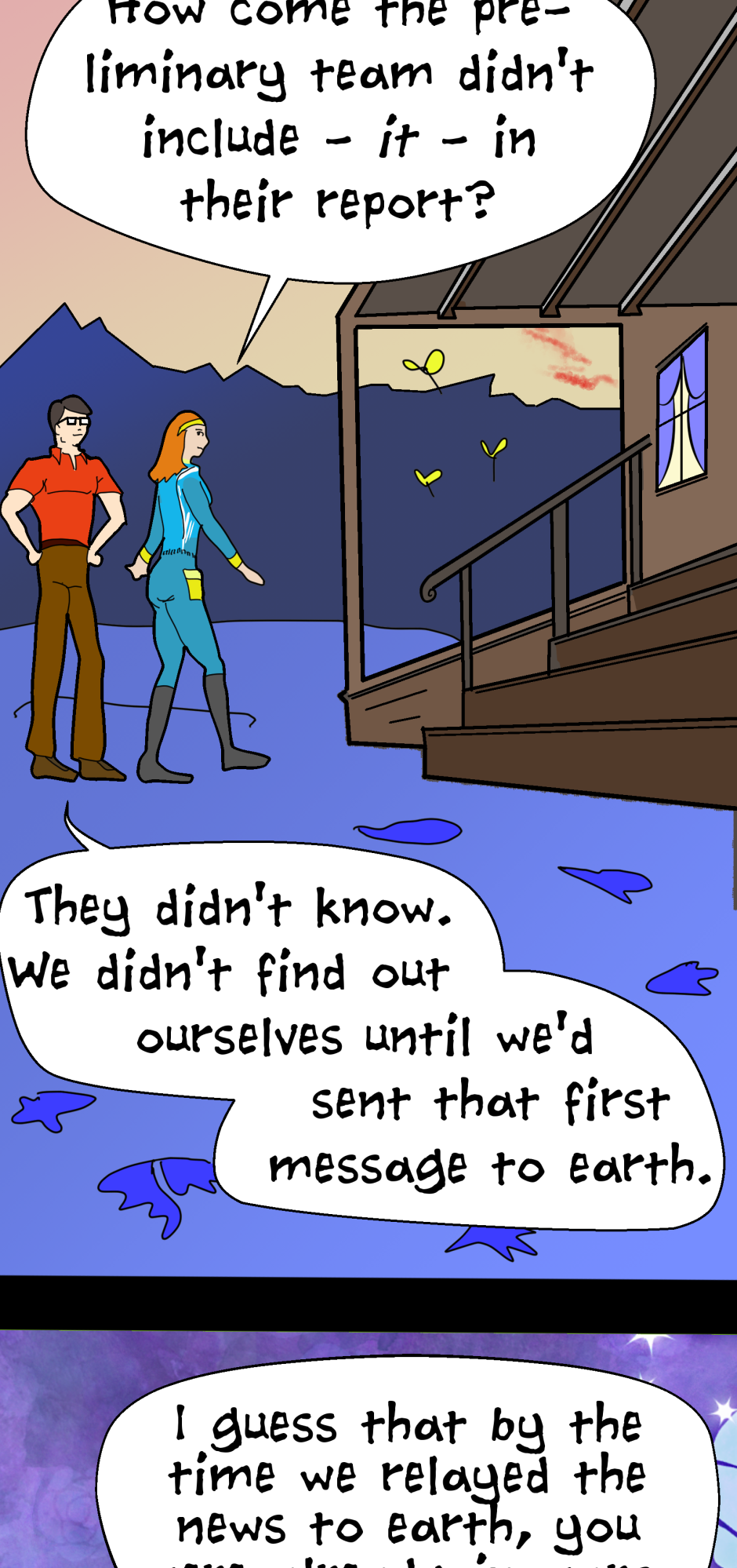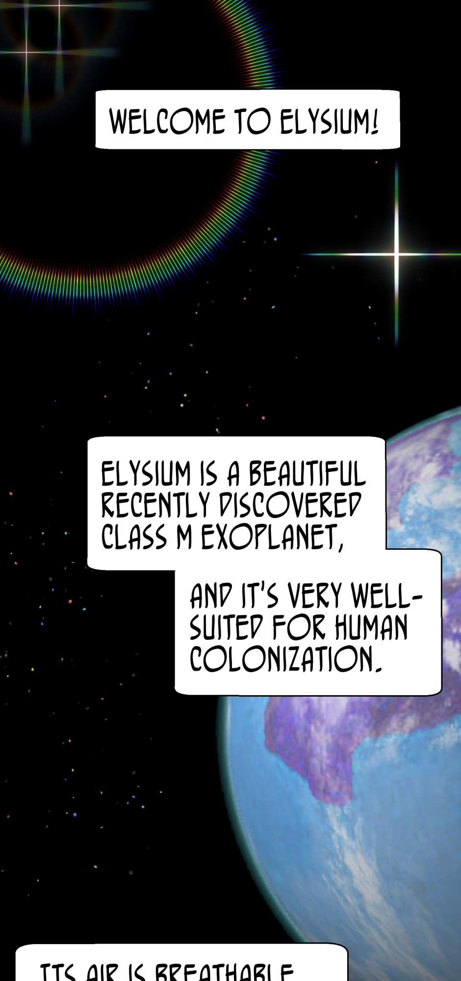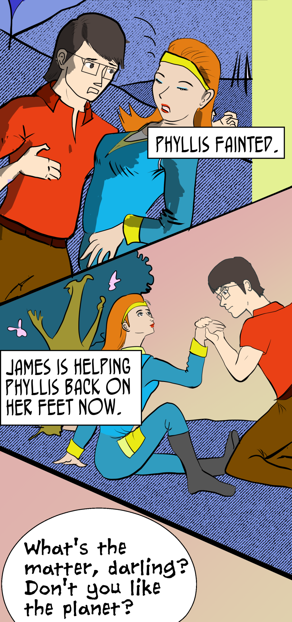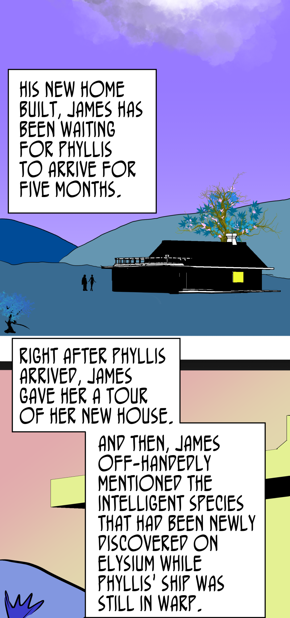 Thanks for reading comics! This is the first episode of "The Venus Trap" and I hope you have a lot of fun reading it. Many more episodes to come, posted as quickly as my skill will let me. Phyllis and James are a more or less normal, newly married couple, and they're living on the alien planet named Elysium.