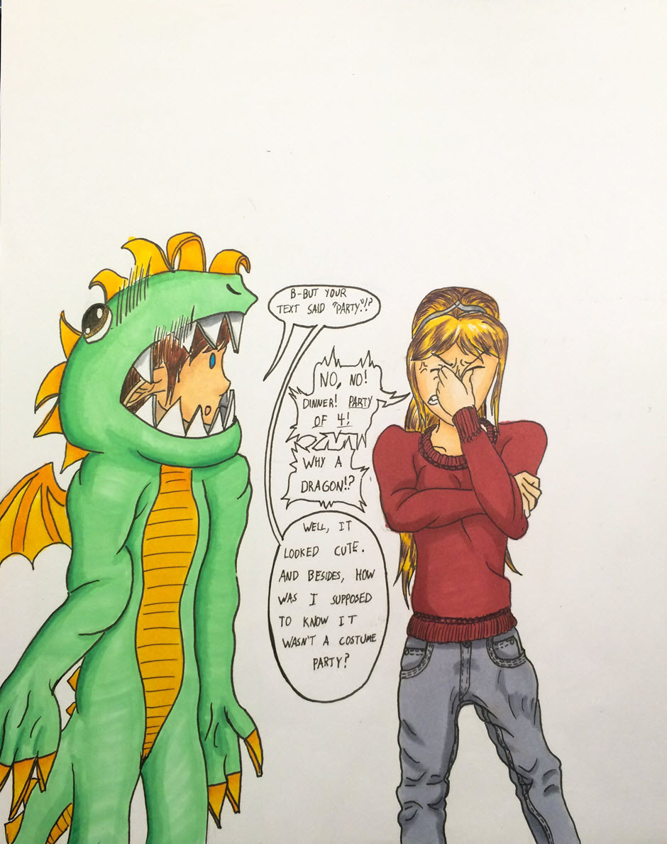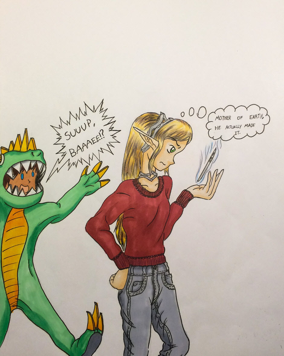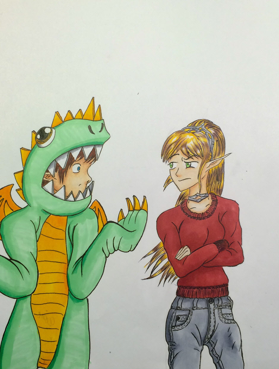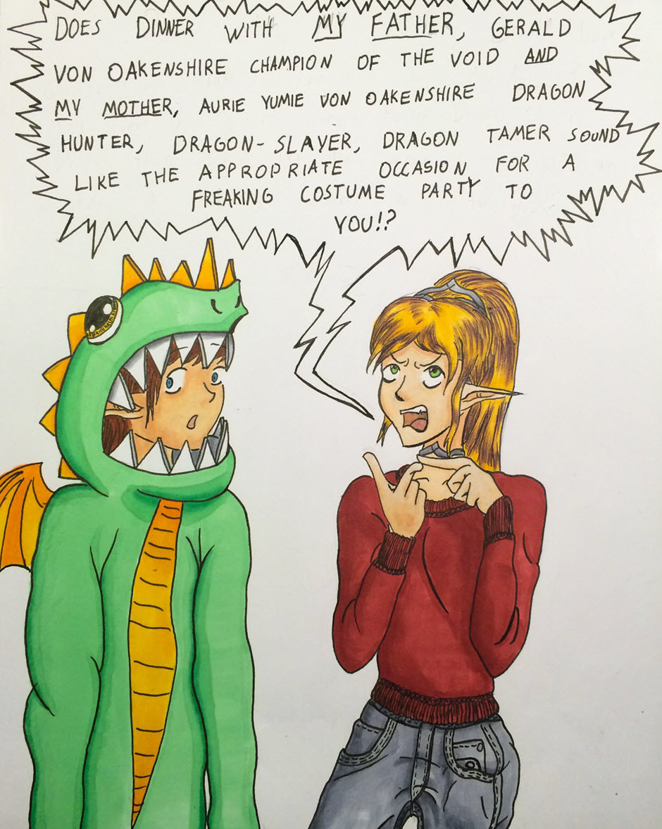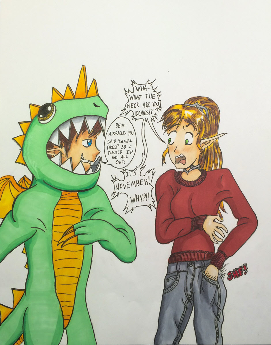 My first comic! Meet Oak Oakenshire and Alex (not sure what his last name is yet.) She's a regal elf lady and he's a computer programmer that loves gaming and being a dork! Together they make a pretty cute couple. But, I guess we'll see what her parents think of him next month. xD
