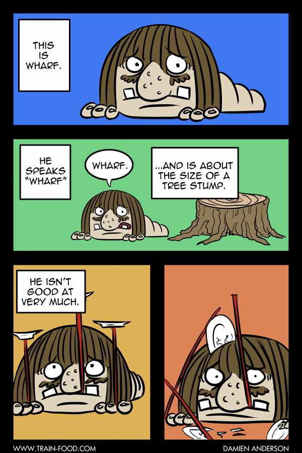 Train Food is an all-ages action adventure story in which a young boy awakens in a strange world where he befriends a variety of unusual creatures including an alien, a talking shadow, and a giant tooth. After receiving random powers from a gumball machine, they travel deep into the heart of The Land, to fight the almighty SOLAR KING!