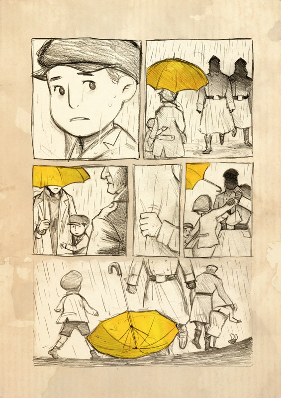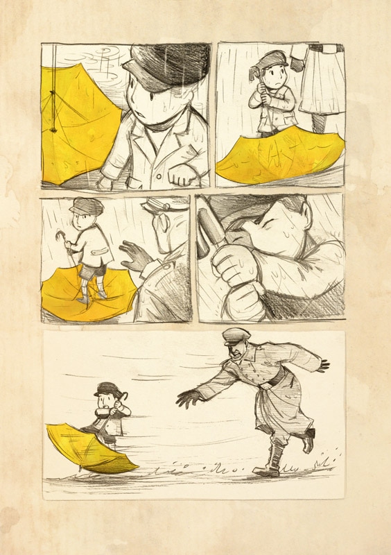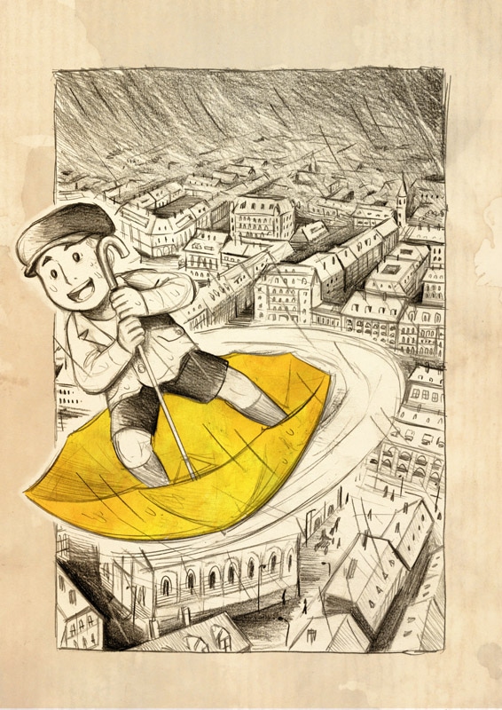 The journey of a boy and his mother's yellow umbrella into a far distant land.
