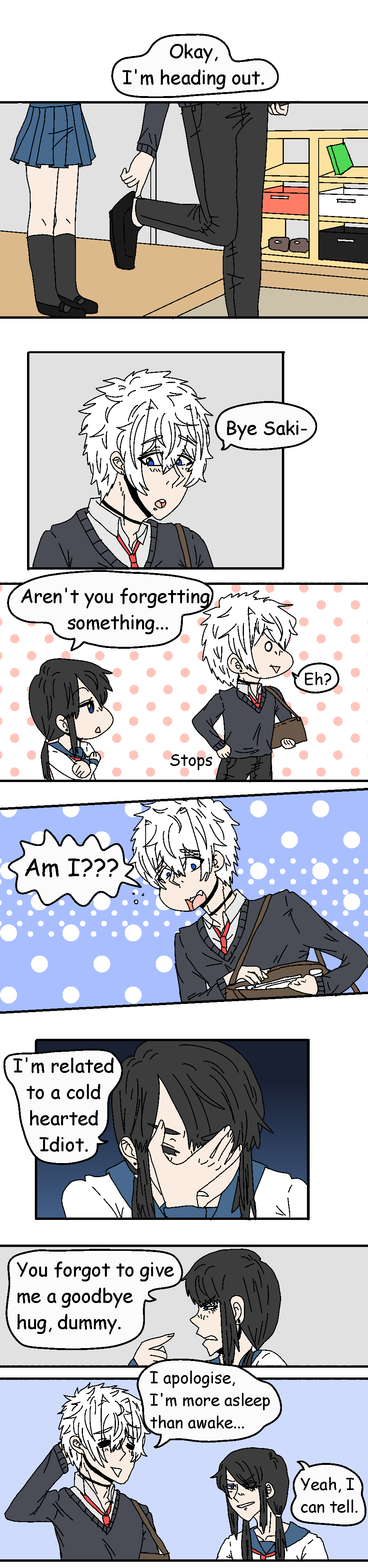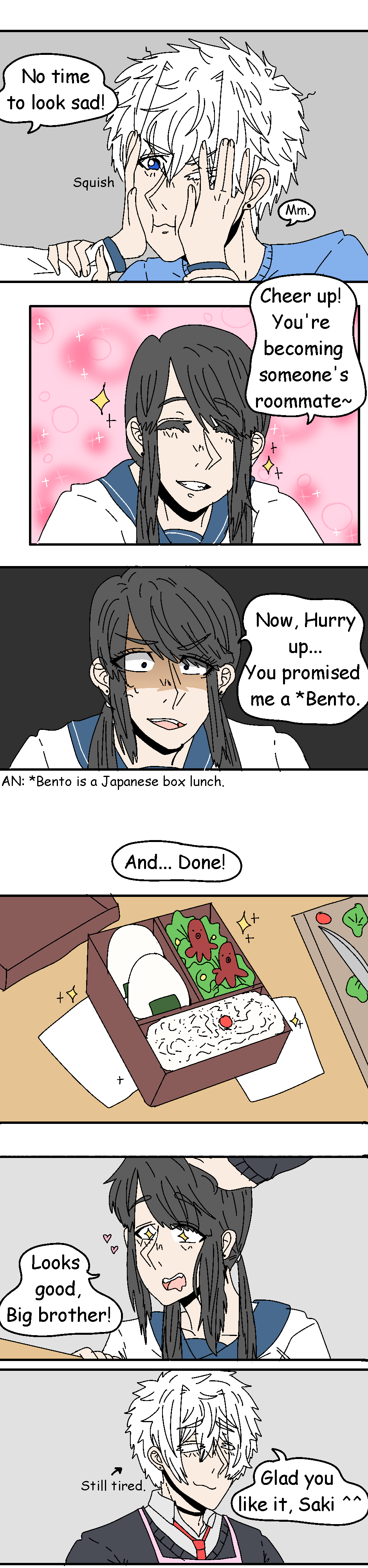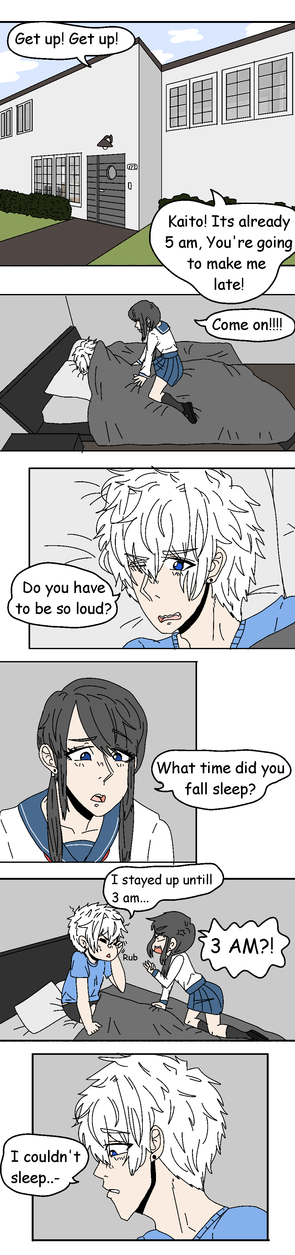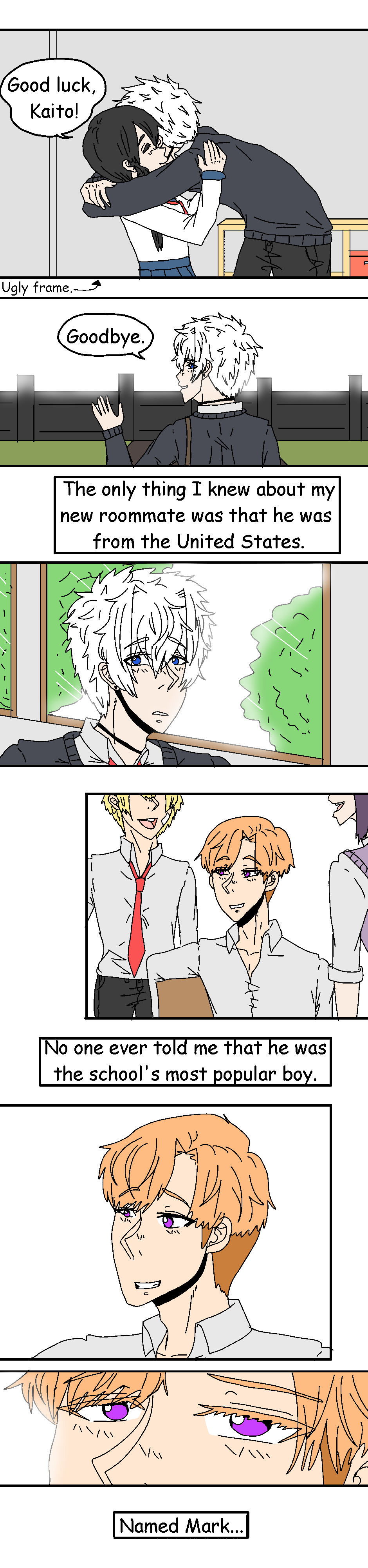Sooooo, This is more of a test than anything... I was going to reveal that Kaito had a younger sister but it would have been later in the chapters. Here I decided that I would start right before he moved in with Mark. Also! I forgot in my old series that Mark is a very popular kid in school. (You can tell that Marks hair is a little shorter, Its because he hasn't grown out too much xD) I love paying attention to small dumb details like that.
