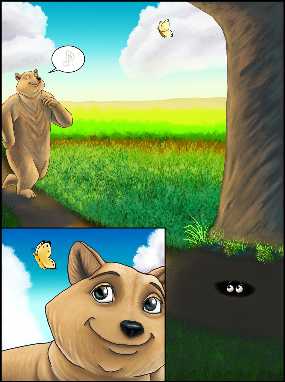 Dave the bear is out enjoying his day when he accidentally gets on the bad side of a grouchy ground squirrel. Will this happy day come to an unpleasant end? Or does the bear hold a secret joy that keeps him from letting the crotchety critter get him down in the dumps?