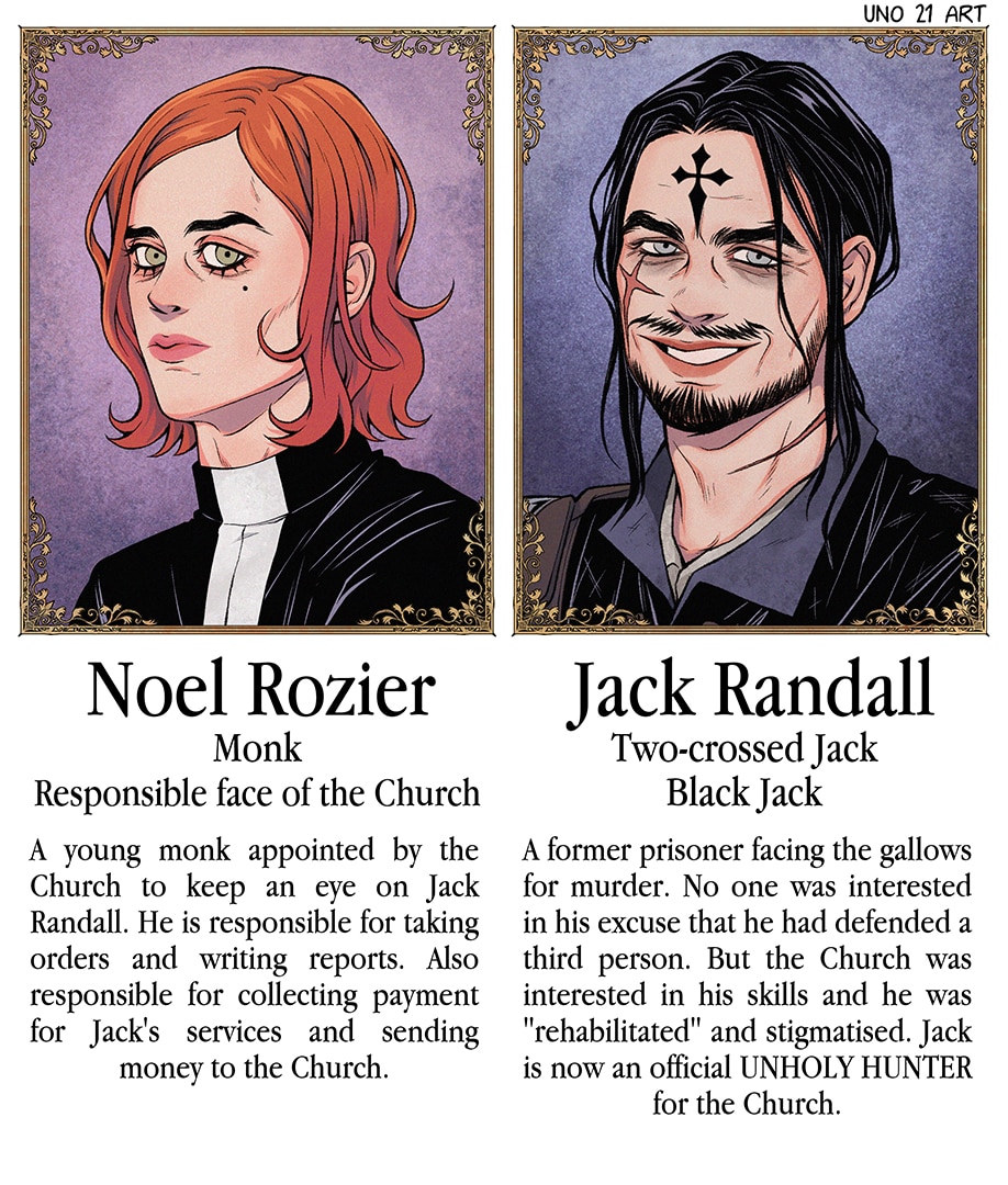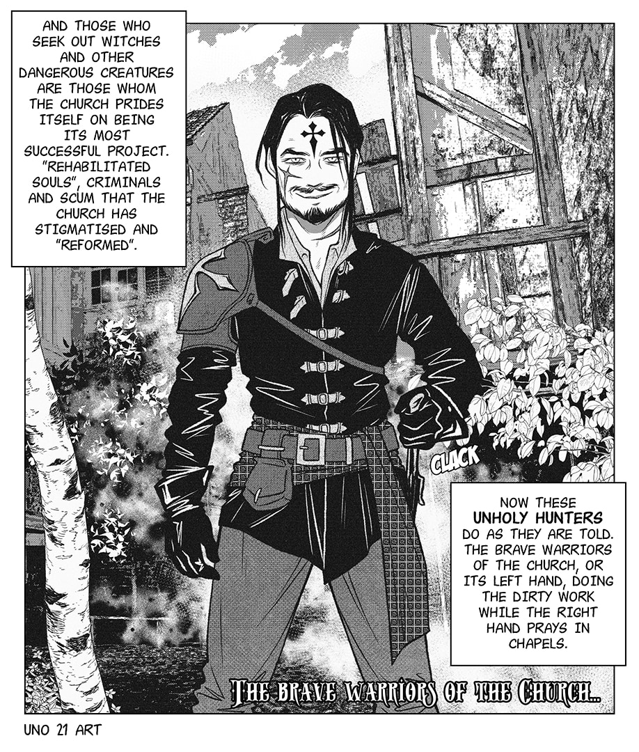And the search for witches and other dangerous creatures is something the Church prides itself on being its most successful project. The "redeemed souls", criminals and scum that the Church has stigmatised and "reformed". Now these Unholy Hunters do as they are told. The brave warriors of the Church, or its left hand, doing the dirty work while the right hand prays in chapels.
