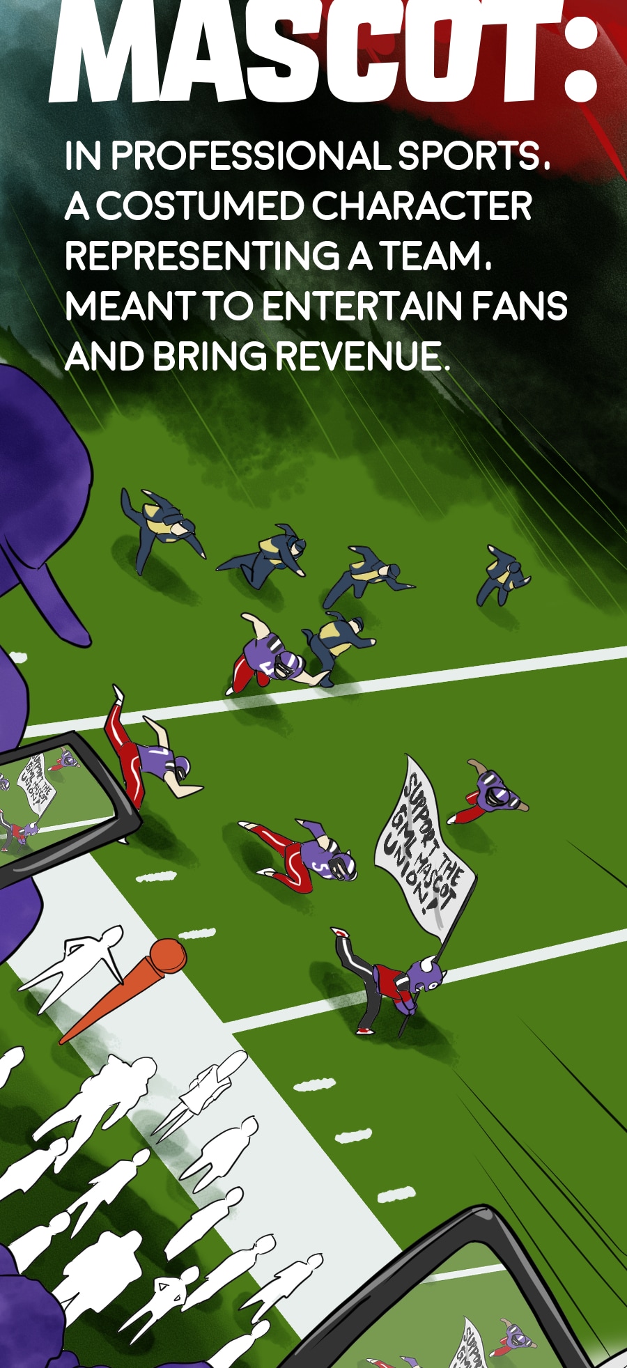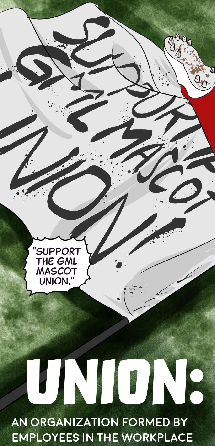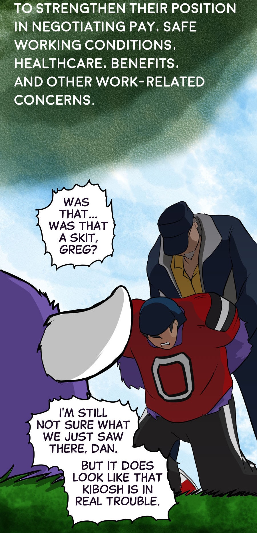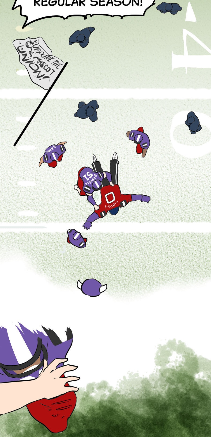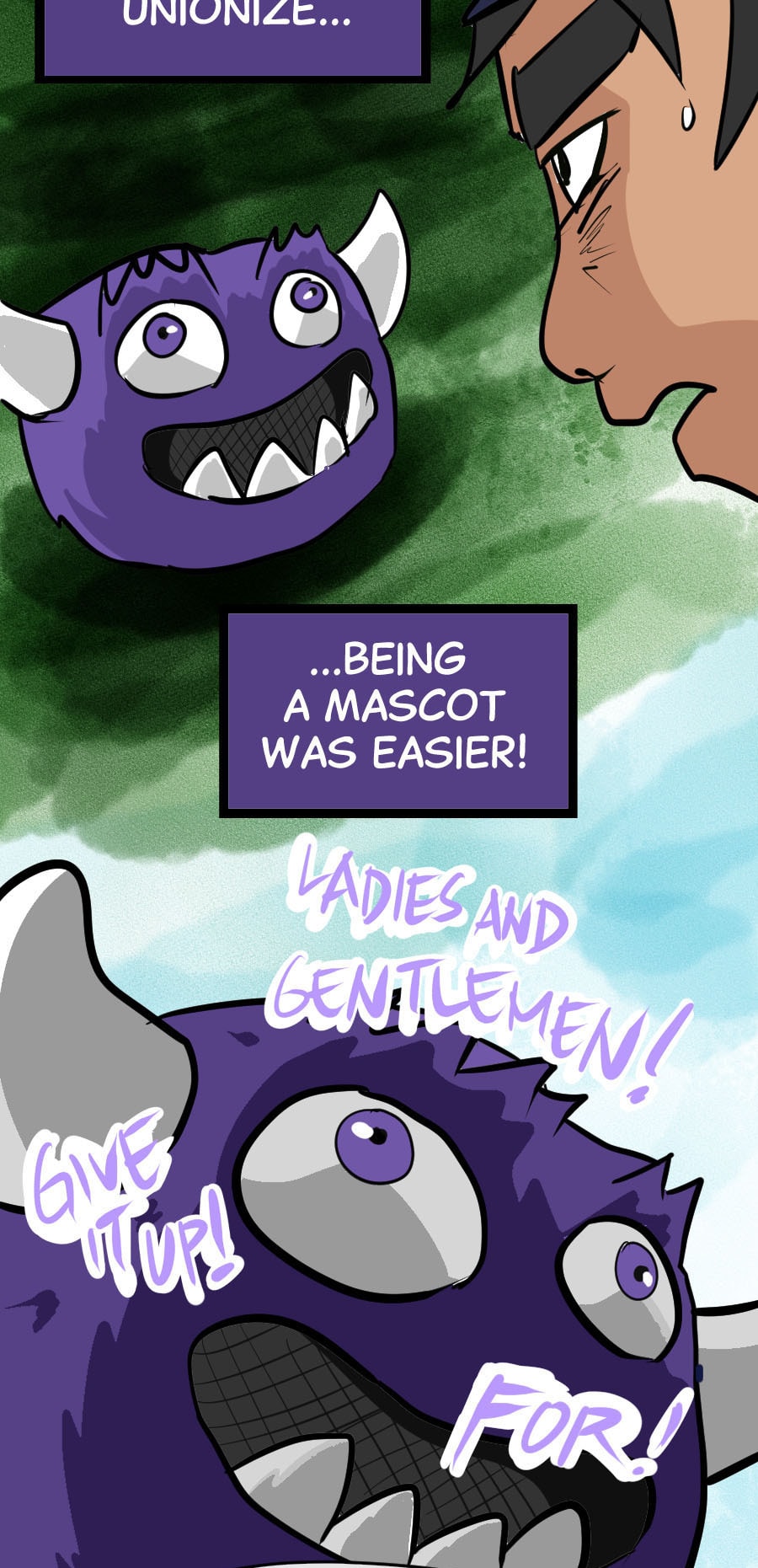 Roo's gig as wacky mascot "Kibosh" might be fun, but it’s riddled with hazards: rowdy fans, unpaid hours, dangerous stunts, and no benefits! Fed up, Roo organizes a mascot union and immediately draws the wrath of his corporate employers. Witness his journey from exploited clown to workplace activist in this Shonen-style dramedy. Even the most absurd of jobs demands dignity, and especially healthcare. Episodes every 7-10 days!