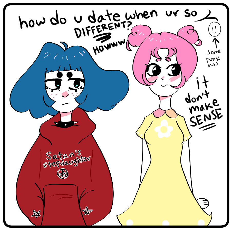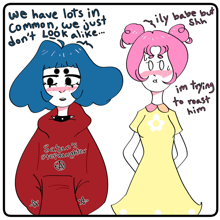 ahhh the first upload of my first comic!! :'D sorry it's so short hehe, still trying to get used to this >w<;; but yes, these poor lesbos just want to walk together without being asked this same question: they may not look similar, but that doesn't mean they don't share interests or wouldn't get along! That's dumb yo, hobbies and passions don't need a LOOK; like what you like as u are u beautiful hoes <3 character page bios coming soon!! As I mentioned, this is my first attempt at a comic, so feel free to offer any advice to this noob~ c: