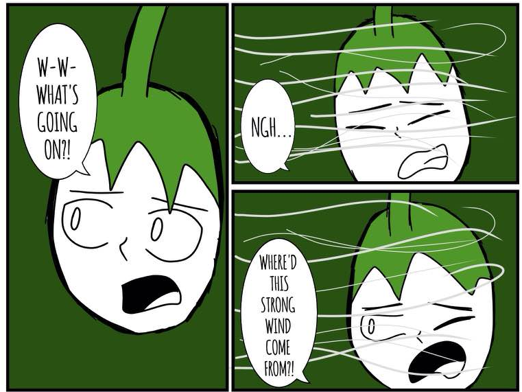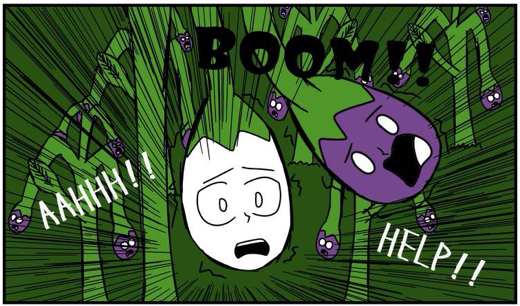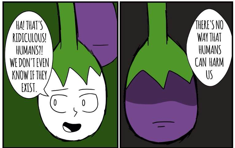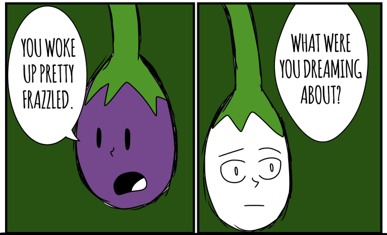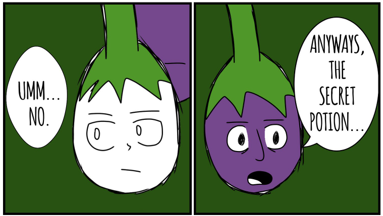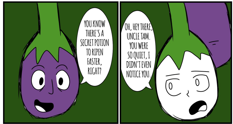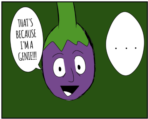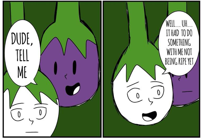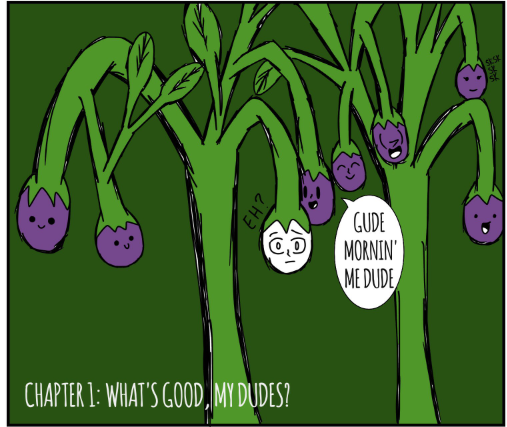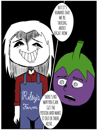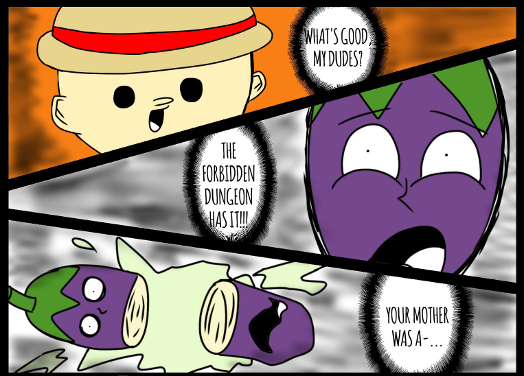 Long ago, his whole eggplant village was murdered by the "Riley Farm" Clan; they were famous for killing all kinds of innocent veggies. This eggplant was the only one to survive because he wasn't ripe. He heard his brothers' and sisters' screams. Now, he's out for human juice...