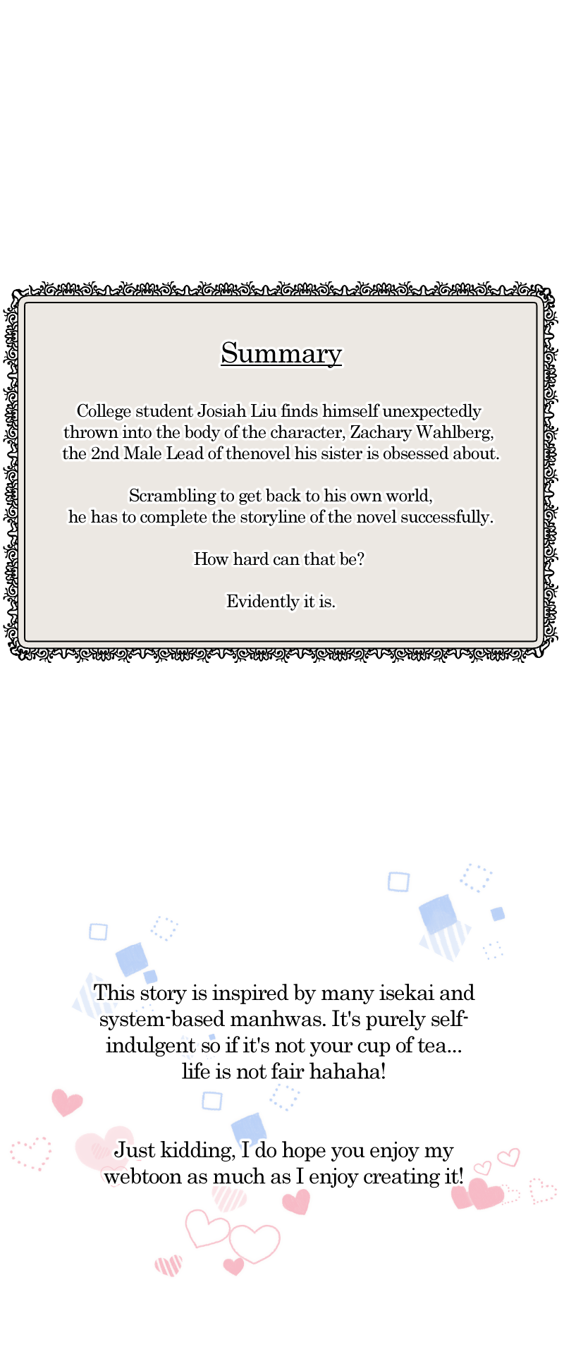 College student, Josiah Liu finds himself unexpectedly thrown into the body of the character, Zachary Wahlberg, the 2nd Male Lead of the novel his sister is obsessed about.