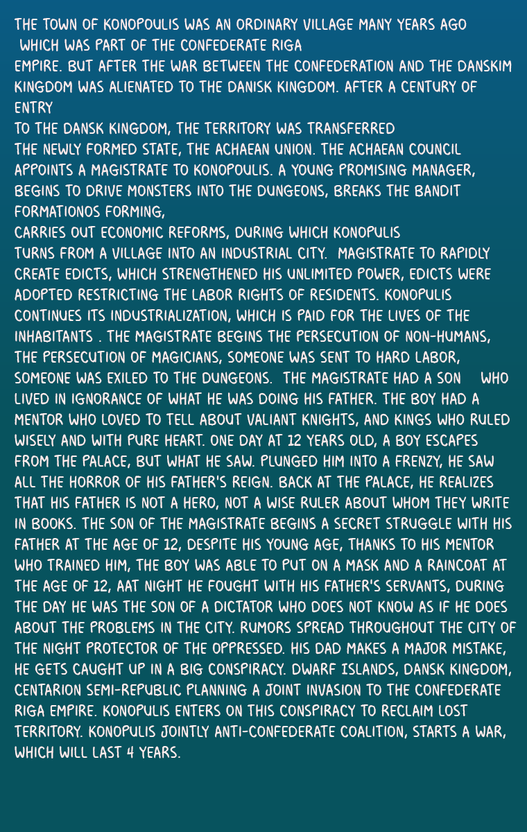 Welcome to the wonderful world where there is magic, gods, demons, and many other creatures on a par with the technologies of the modern world, and the walls still protect the cities. The events of the comic will take us to the city of Konopoulis, where the dungeons have become the center of economic attraction. Adventurers say about this city, here you can become rich, but this is today! - , And tomorrow? - . Well, what about tomorrow? Well, tomorrow we will see how your stars will turn out.