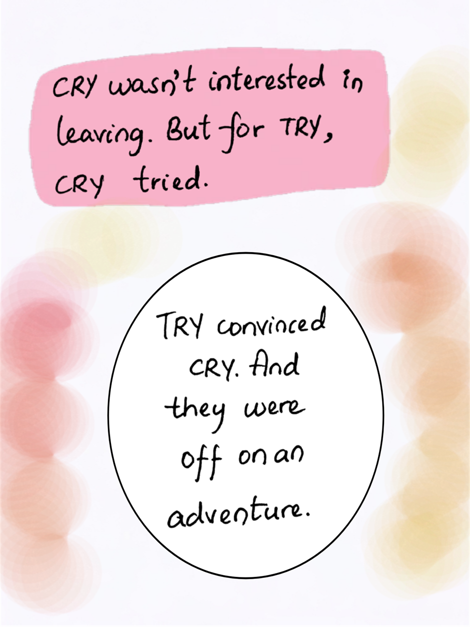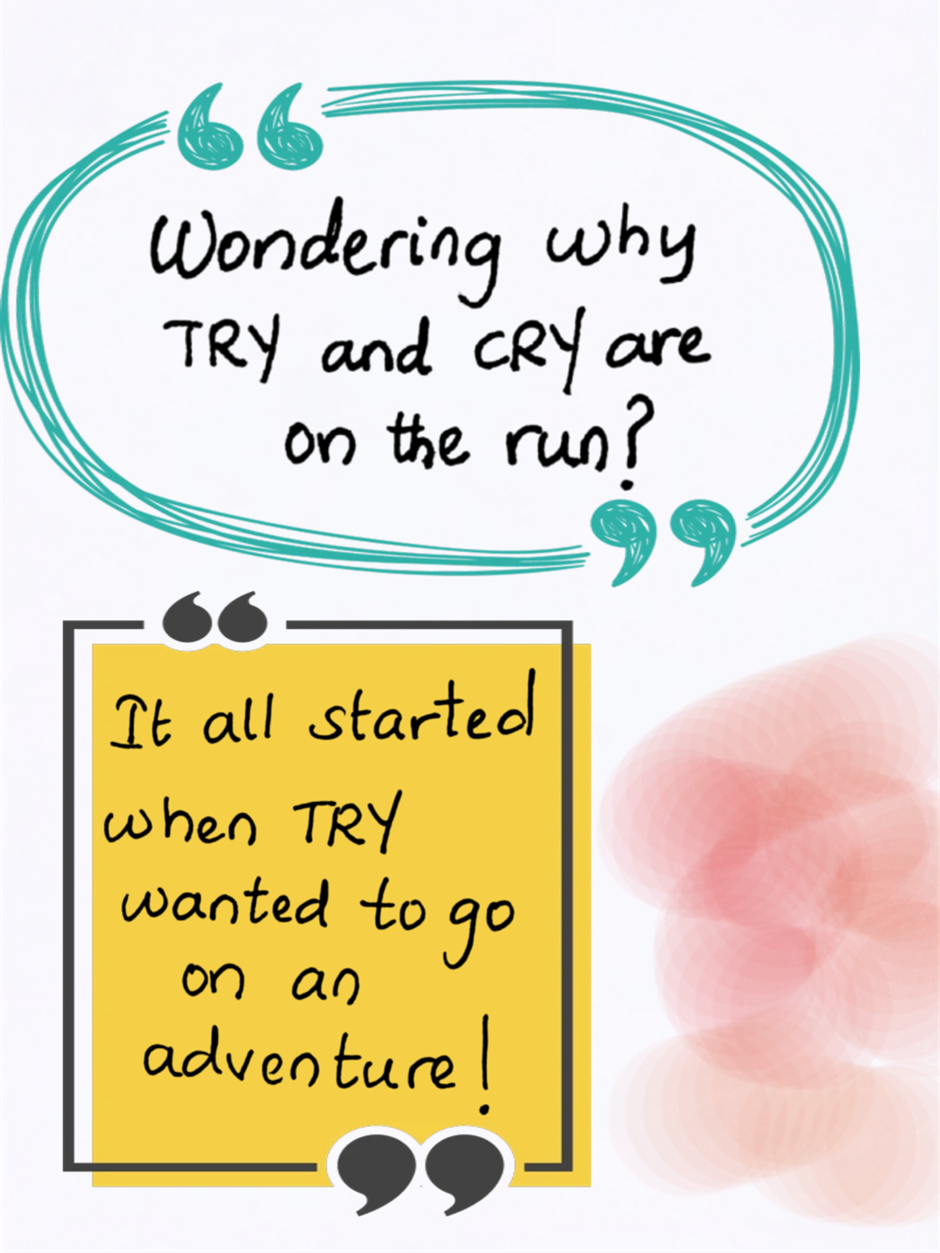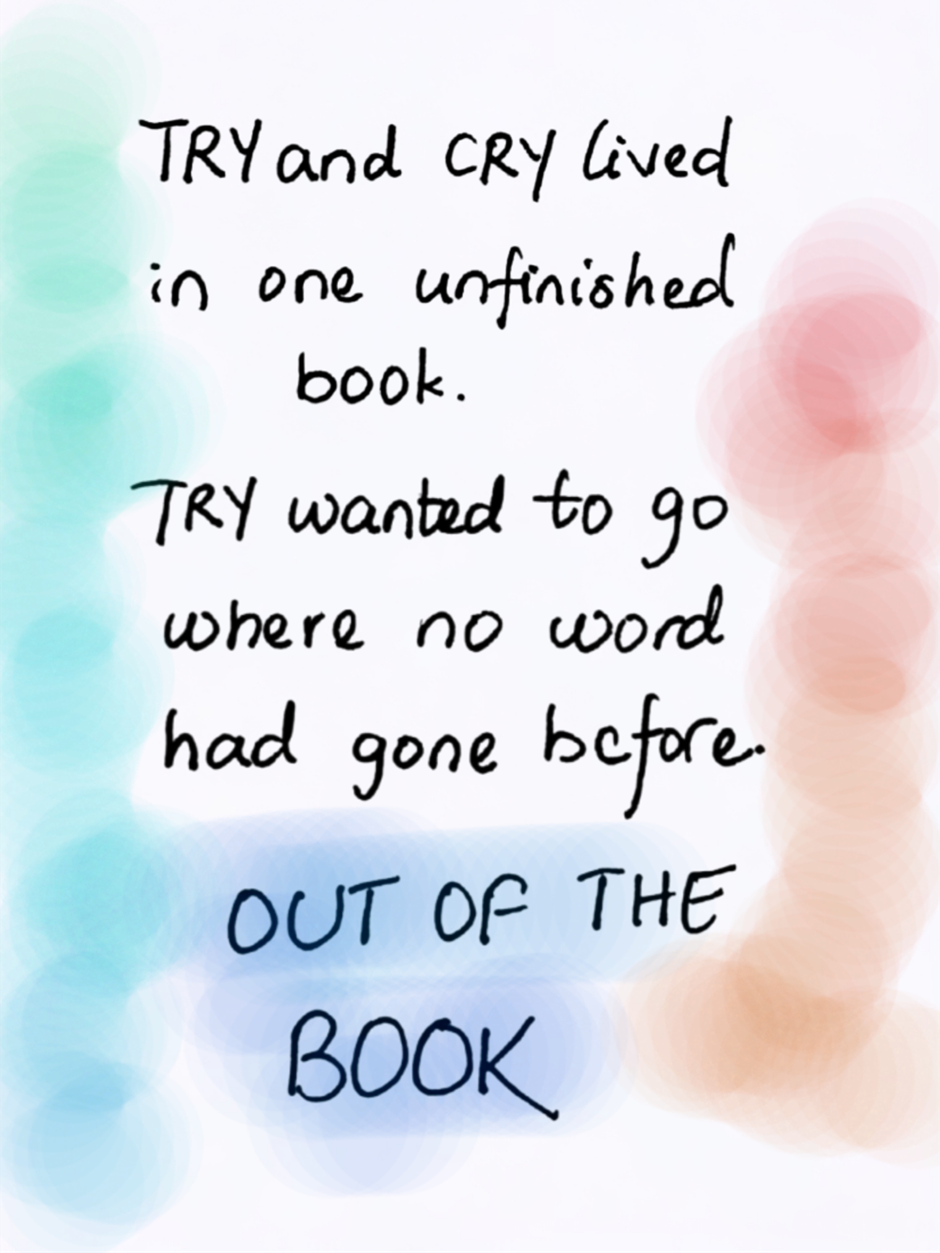 TRY and CRY, two words are on an adventure to meet new words. They are from an unfinished book so they do not know that the world of finished books isn't all rainbows and sunshine. The finished books face neglect and even the extremely bad fate of being forgotten. How will TRY and CRY help the words they met and save them from being forgotten? Can they make the author change her mind and get their happily ever after?