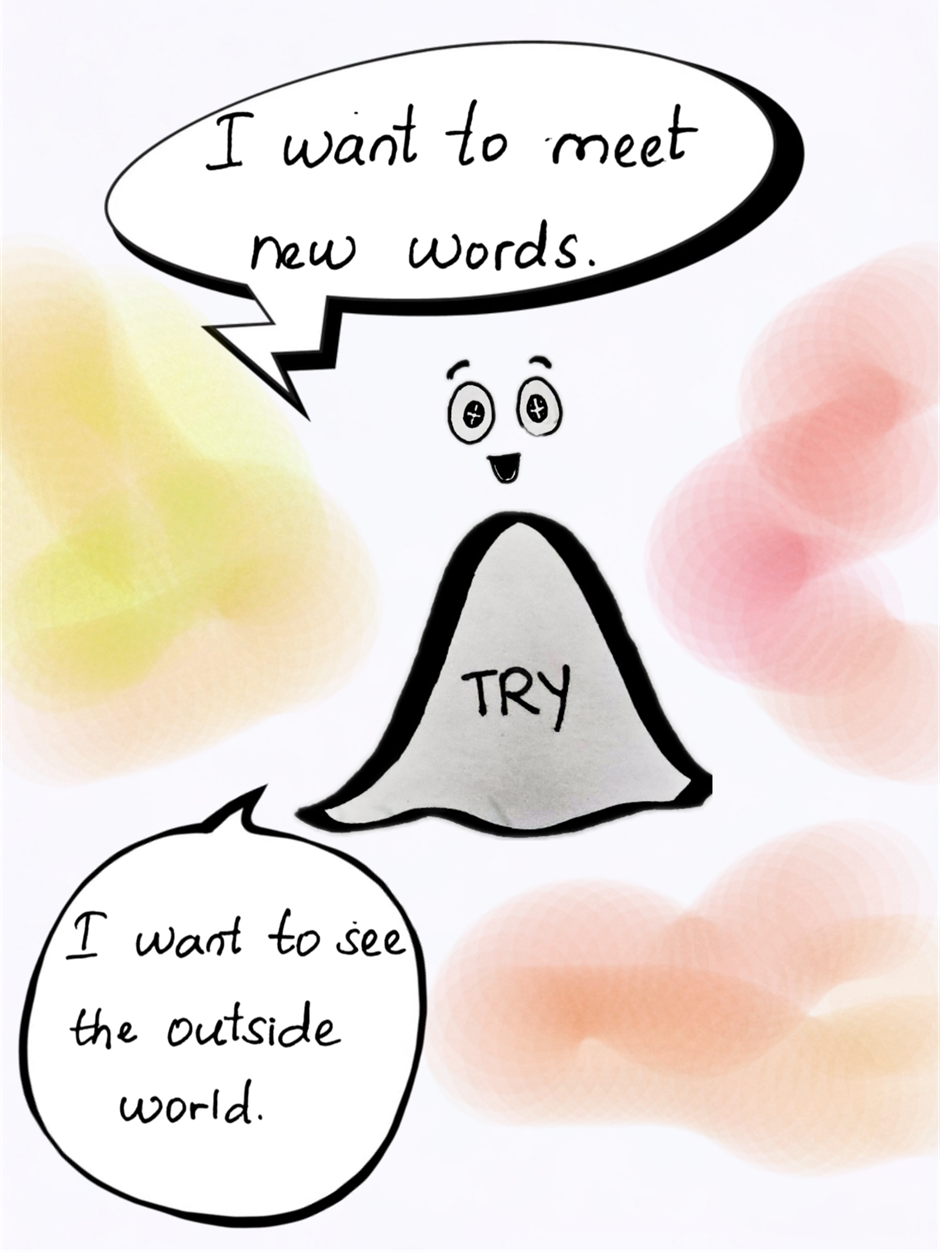 It was when TRY decided to meet new words and go 'Out of their book', TRY met many realized words like UNIVERSITY, PAINTING, BOOK, and many others. So TRY wanted to see the world outside.