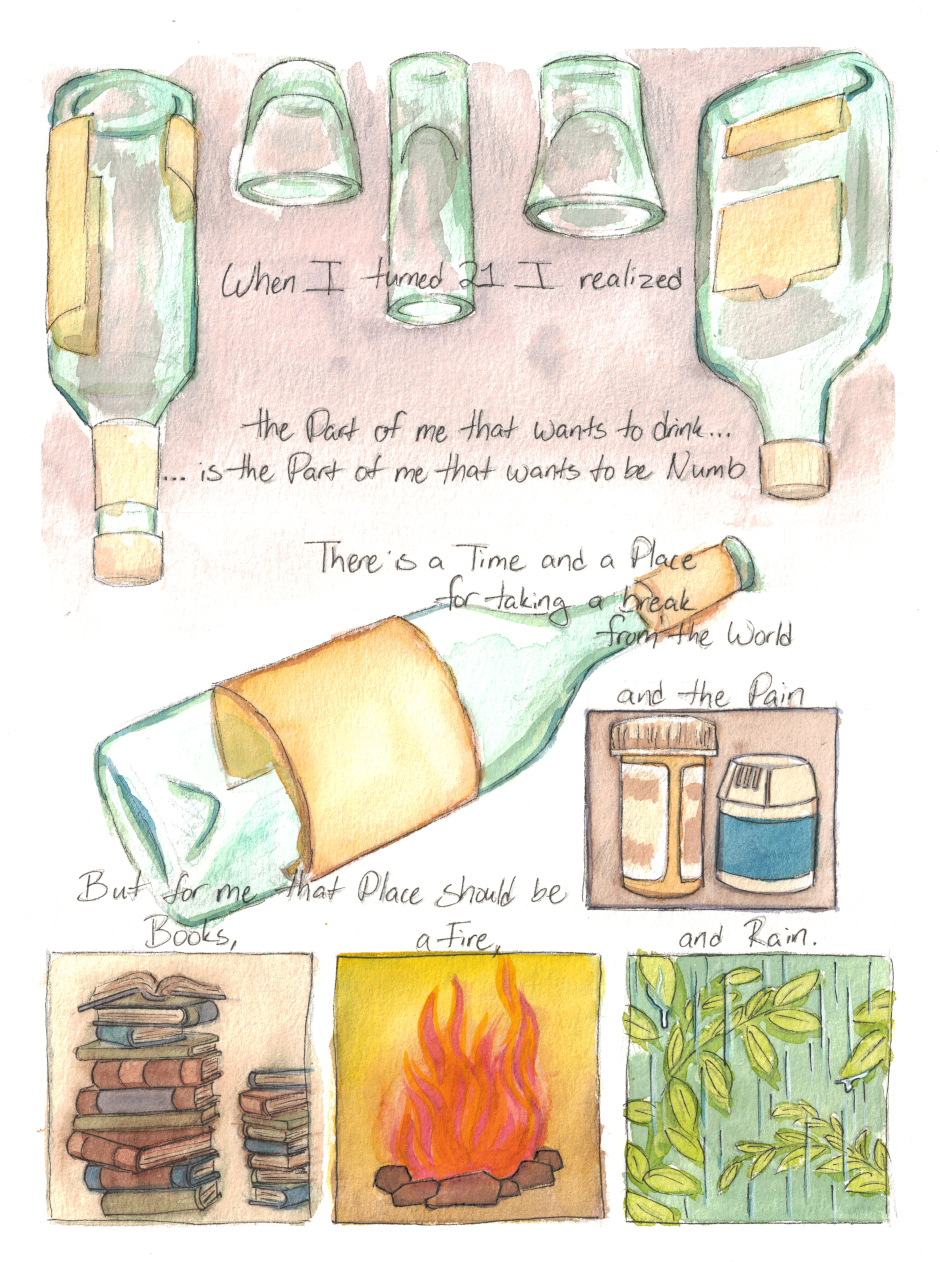 a one page comic about feeling drawn to alcohol, and resisting that pull.