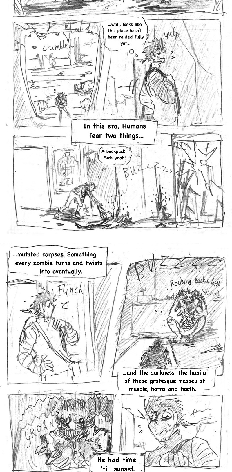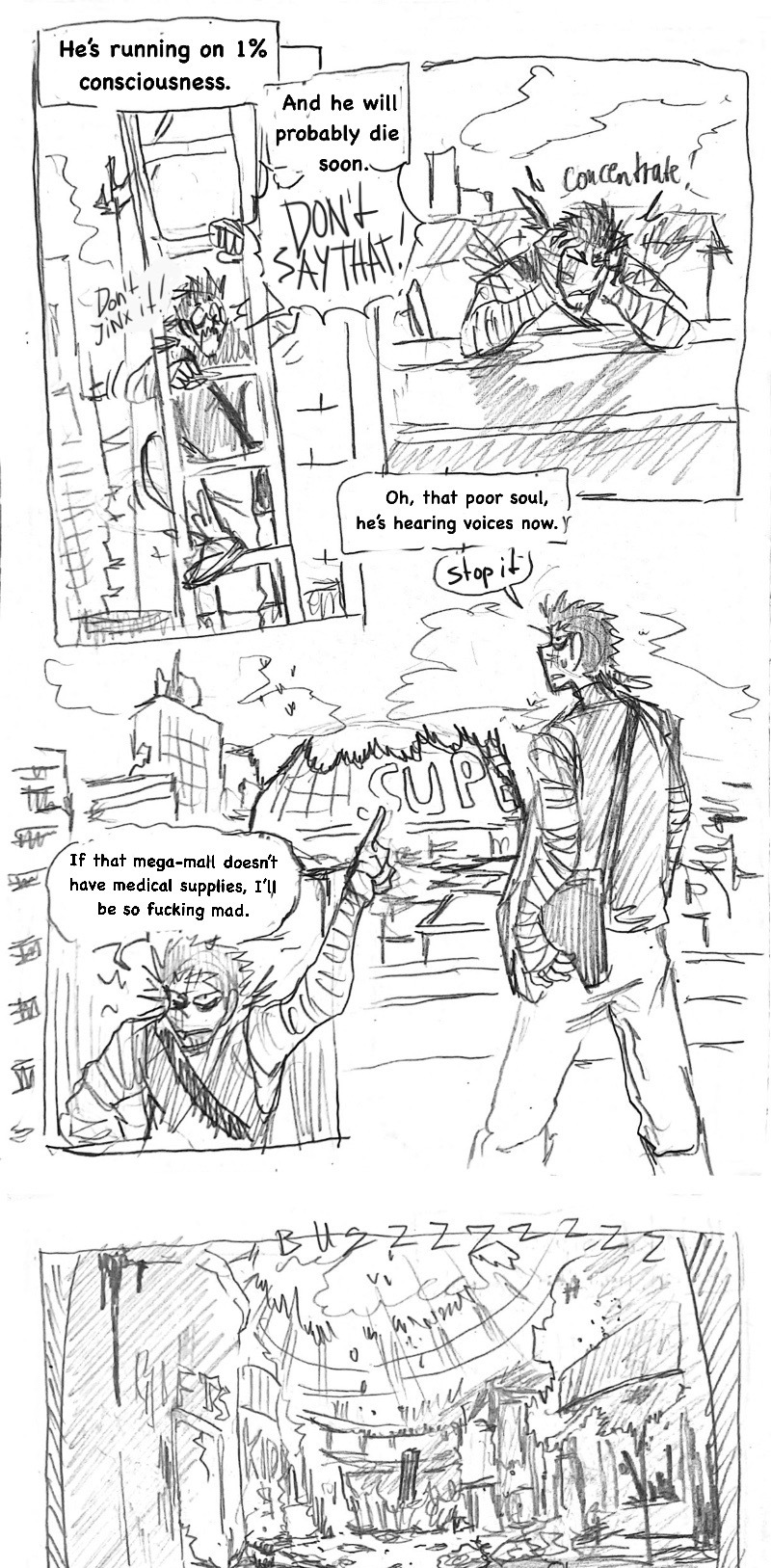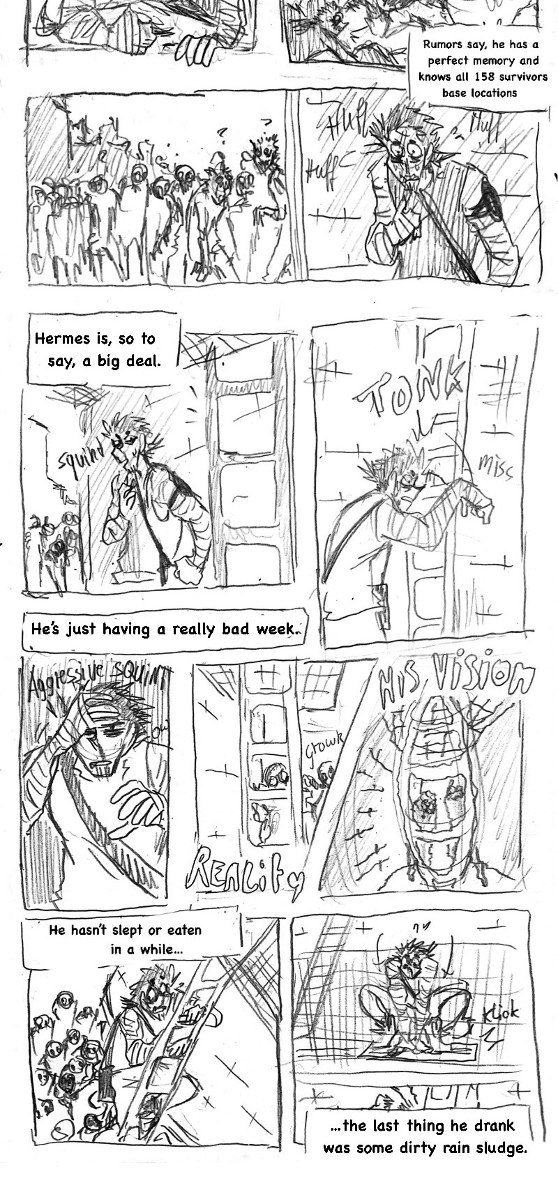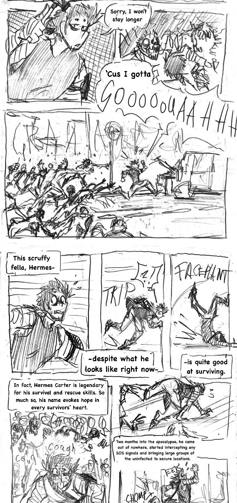 (this is such a shitpost comic lol) Three years ago, when the infection started, he came out of nowhere, wandering the empty streets, sleeping under the stars and pushing himself to inhuman distances just to help other living beings. Name's Hermes Carter. He's one of few brave (or insane) humans, that dare live in the wilderness among the undead and the mutated, constantly on the run from those gore-ish forces. Eventually, a dead end in a collapsed mall leaves him desperate. What now?