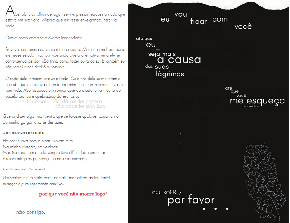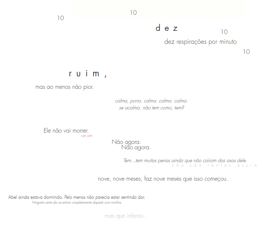 automutilação (implícito, descrição/ilustração de cicatriz), alcolismo, relações abusivas, descrição/ilustrações de ferimentos e cicatrizes no geral, gravidez indesejada (ambíguo), aborto/aborto espontâneo, tortura, morte, relações sexuais (implicado), tentativas de suicídio (sem morte), pensamentos suicidas de personagens, cirurgia, cenas de hospital, transfobia (eu sou trans, eu tenho o mínimo de tato pra escrever isso eu acho), microagressões, discussões sobre religiões (religiões fictícias), trauma religioso (religiões fictícias)
