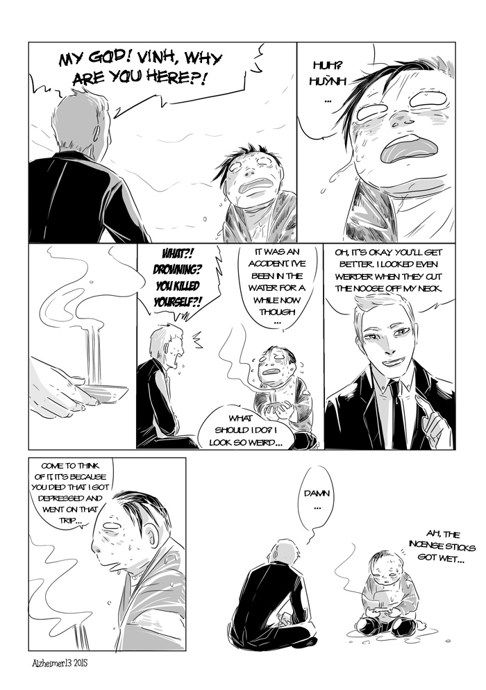 Tumblr: http://vincom-center.tumblr.com/post/131853736396/afterlife-daily-day-1 A new series lol. In which 2 guys are dead and the (under)world still hasn't done messing them up. This comic has a lot of elements from Buddhism and Chinese folklore with which I am not familiar, so I'm sorry for any mistakes in advance! Next update: 10/31/2015