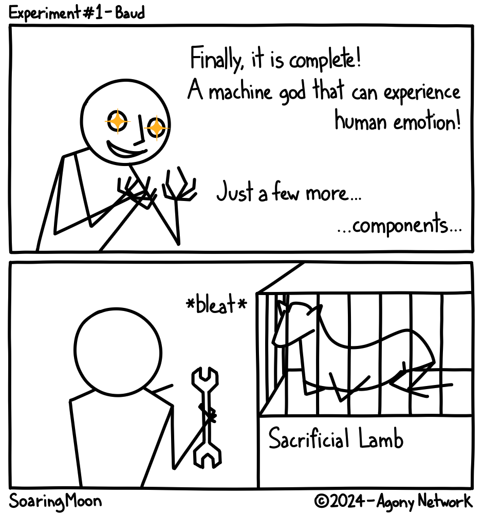 Finally, it is complete! A machine god that can experience human emotion! Just a few more... ...components... *bleat* Sacrificial Lamb