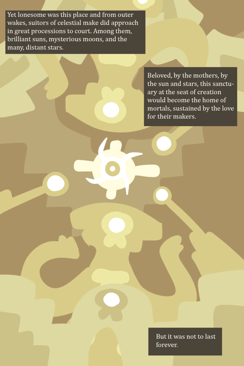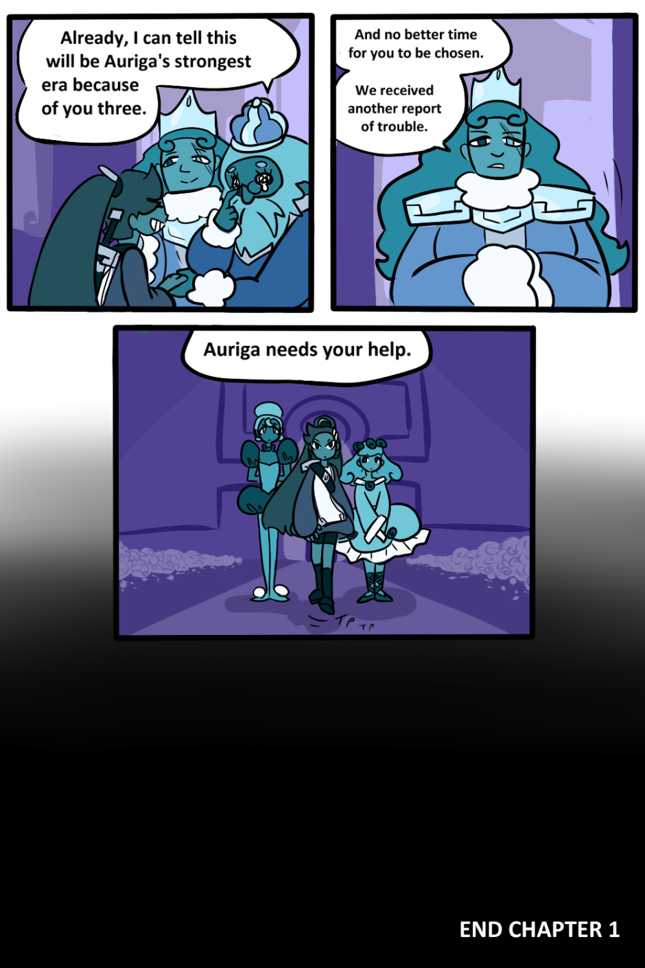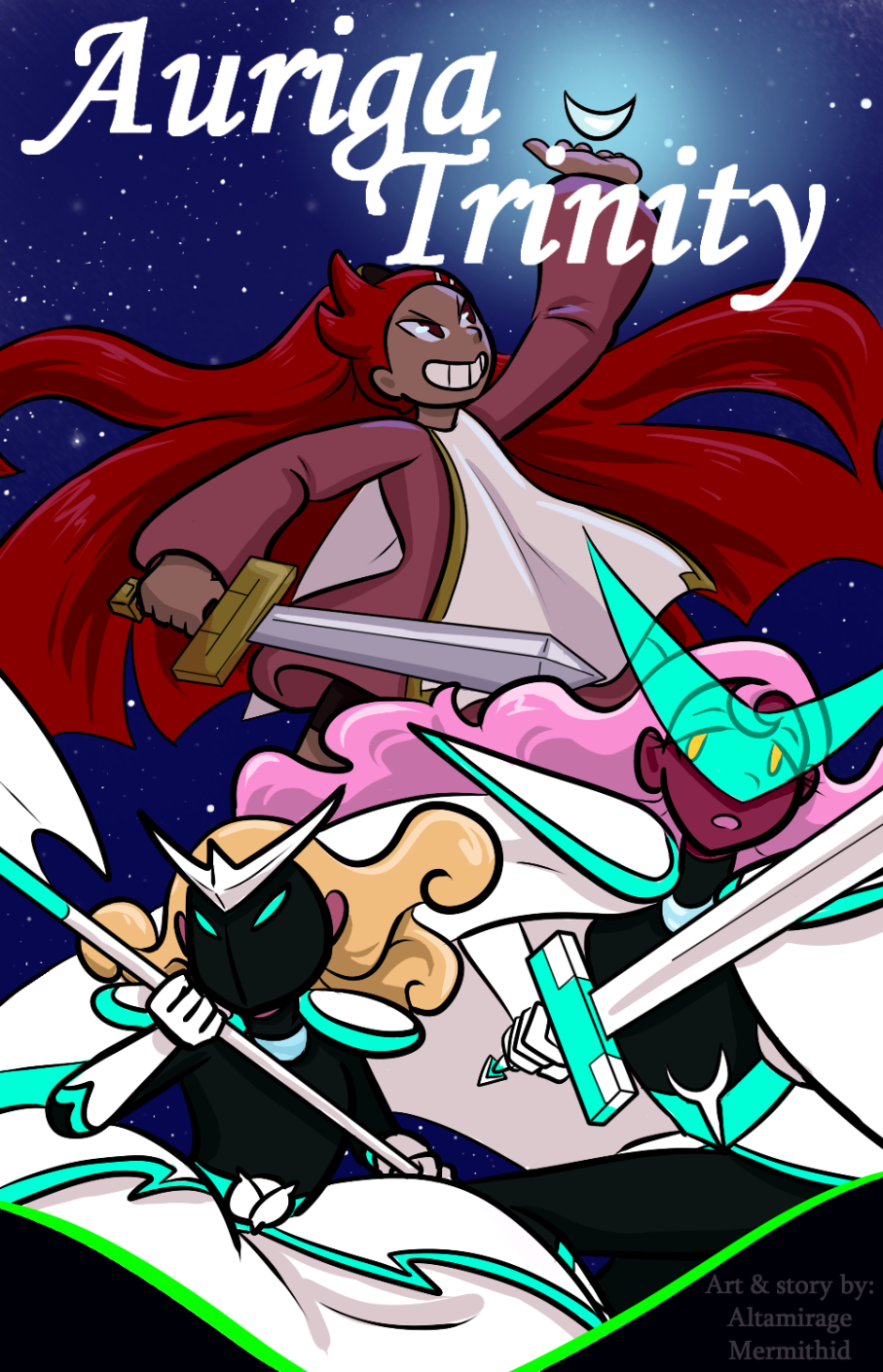 Auriga Trinity follows Prince Lyre, Princess Capella, and their knight and best friend Arc. The trio are gifted magical powers by a long-silent goddess to fight against the Fell, strange monsters plaguing the world.