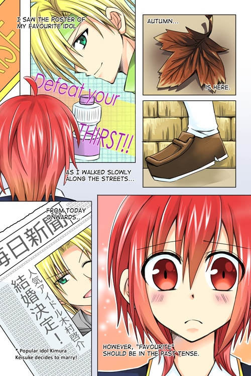 Feeling depressed after hearing the news of her favourite idol getting married, Suzune was walking home one night when she met a handsome person who caught her from a fall. He is the newbie singer who suddenly took the city by storm with his debut! With her new idol, Suzune is going to live her happy star-chasing life again~ (Note: This is a remake of the original one-shot which I drew in 2007 if you have read it before on SJ, but I am trying to make this slightly longer with better art~)