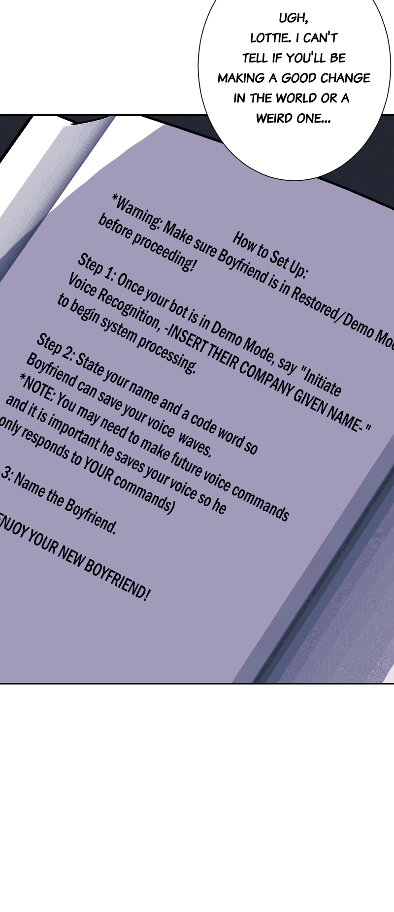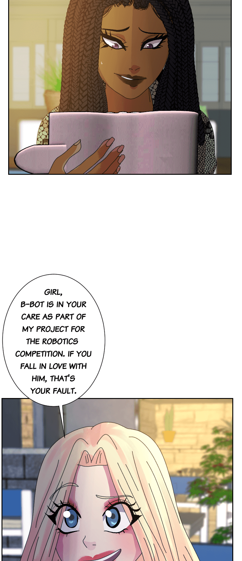 There's a robotics competition coming up and Lottie enlists the help of her best friend, Yahani, to test out her latest invention: "B-bot"- the perfect robotic boyfriend. After taking him home and finding out a devastating secret her boyfriend was keeping, Yahani decides the idea of being with someone who is programmed to love her feels wrong. But then "Brobot" shows her what's on page 85 of his manual: "FREE MODE..."