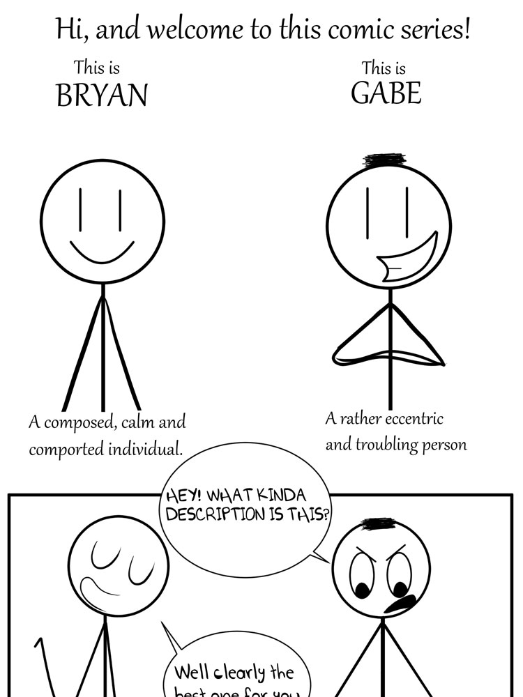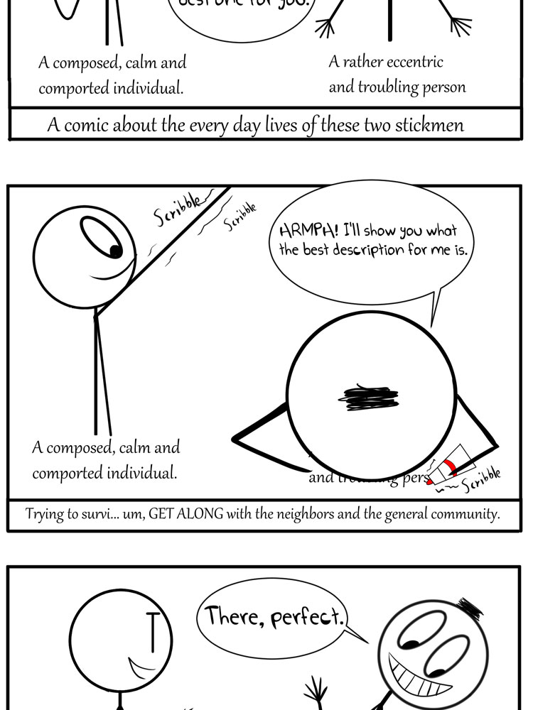 Here's a comic series about the everyday lives of two stick men trying to adapt to an all-new society, making their best attempts to live calm and peaceful lives(well at least one of them). Watch as these two try to survive the endless situations and encounters they face in this new and exciting community, and be amazed by the style changes and the different forms this comic series will take!