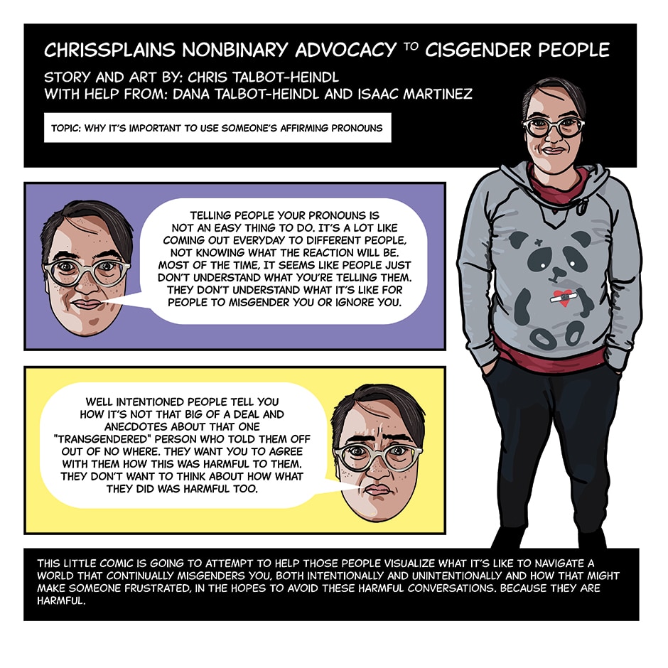 This is a non-fiction comic that explores real life scenarios that were hurtful to real life nonbinary individuals (scenarios have happened to real people who have submitted them for this project). Chris explains why it was hurtful and how people could have done better to make their nonbinary friends and family feel seen, heard, and affirmed.