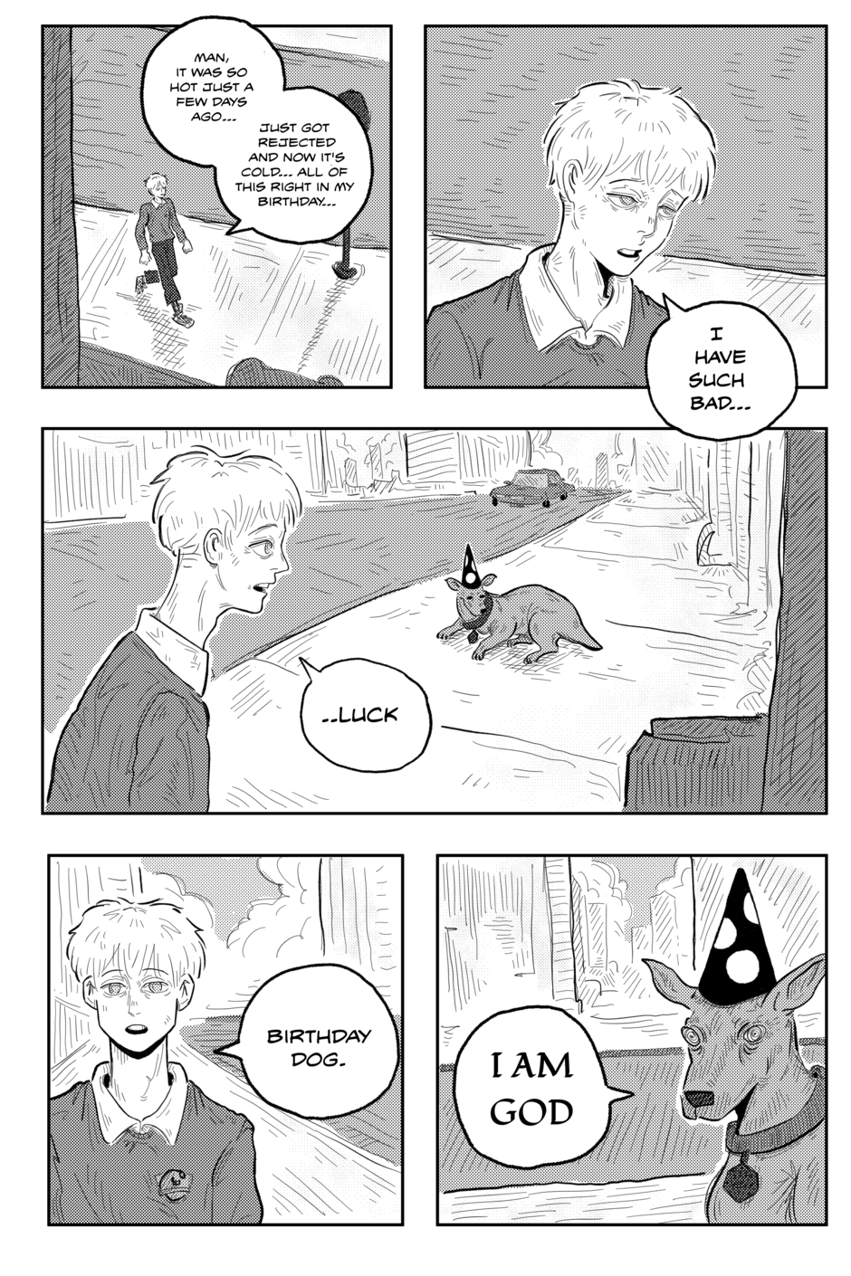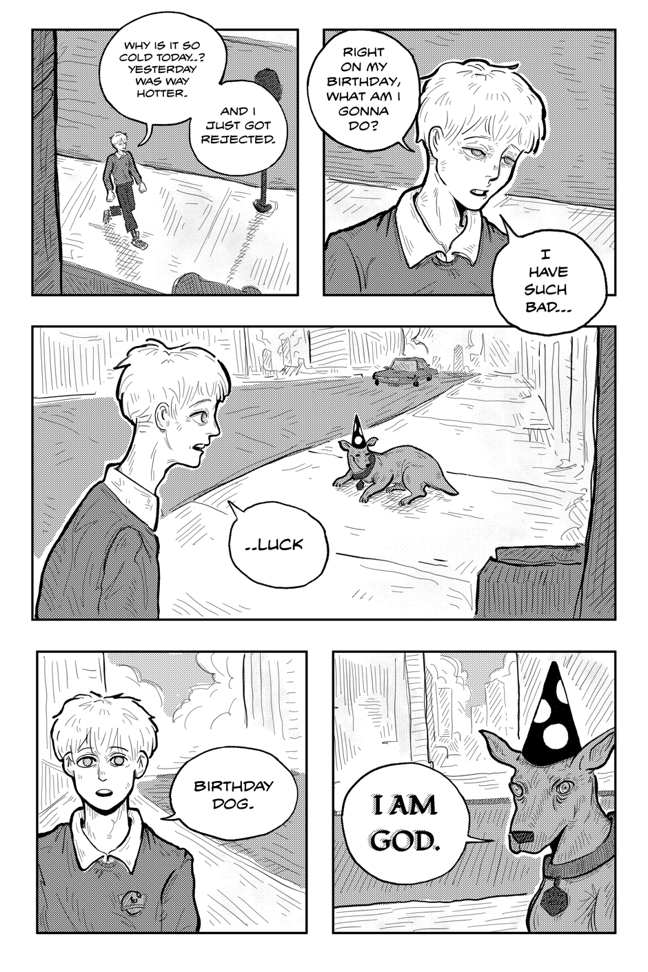 Things happen, this is life's fact. After getting rejected on his birthday, Alex comes across a dog proclaiming to be God. Now, apparently stuck in a medieval world, the boy must decide how