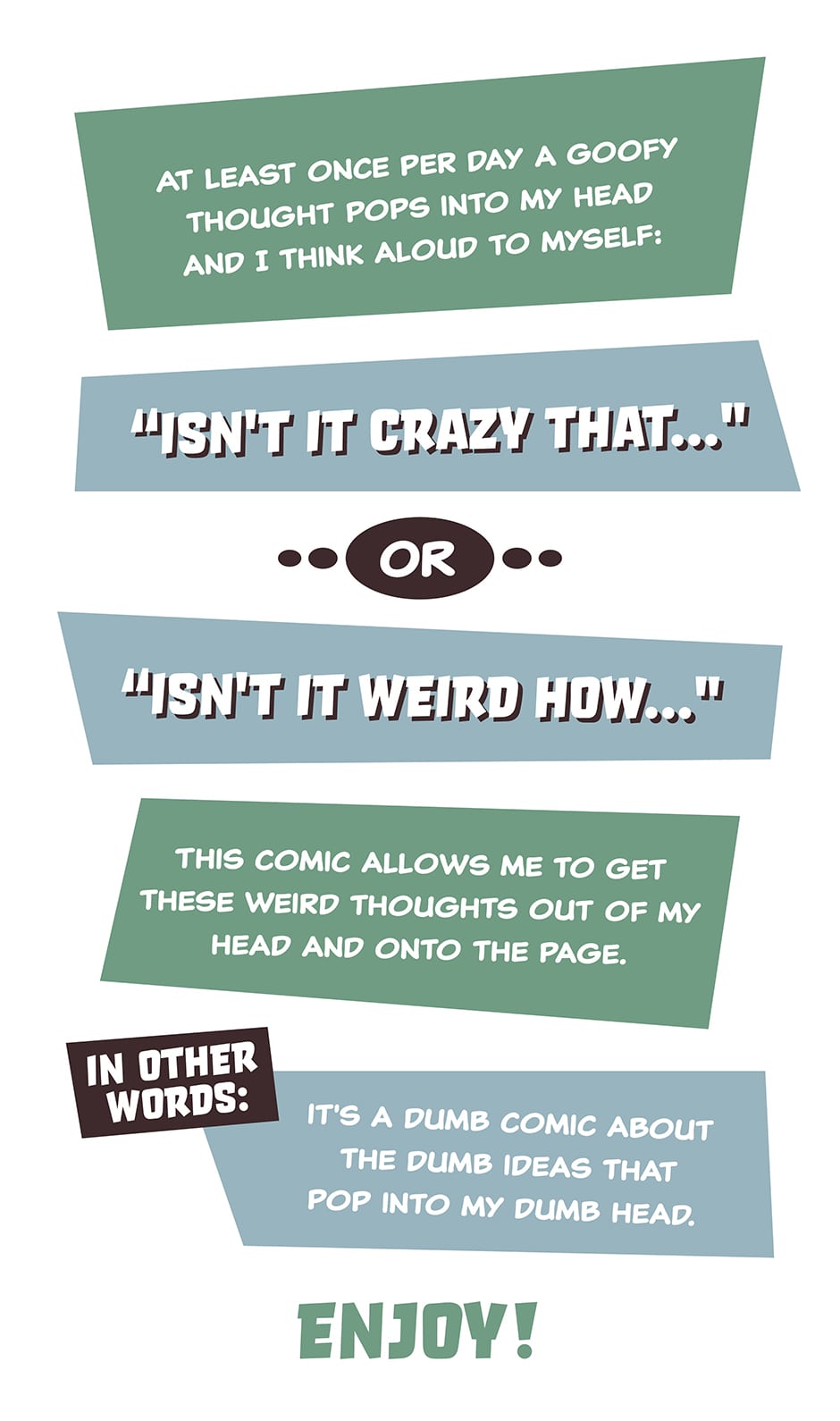 At least once per day a goofy thought pops into my head and I think aloud to myself "isn't it crazy that..." or "isn't it weird how..." - this comic allows me to get these weird thoughts out of my head and onto the page. In other words - a dumb comic about the dumb ideas that pop into my dumb head. Enjoy!