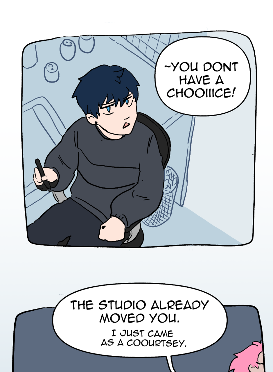 This is pretty good! I'm loving the storyline so far and the character designs! Short, simple, and to the point. I'm curious to see if Roy's feelings towards working with BL will change. I know how it feels to work on something you might not like, but it is part of the job. But ey -- he's rocking that artist look: sweats, baggy hair, and dead eyes. Truly a gem of our generation.
