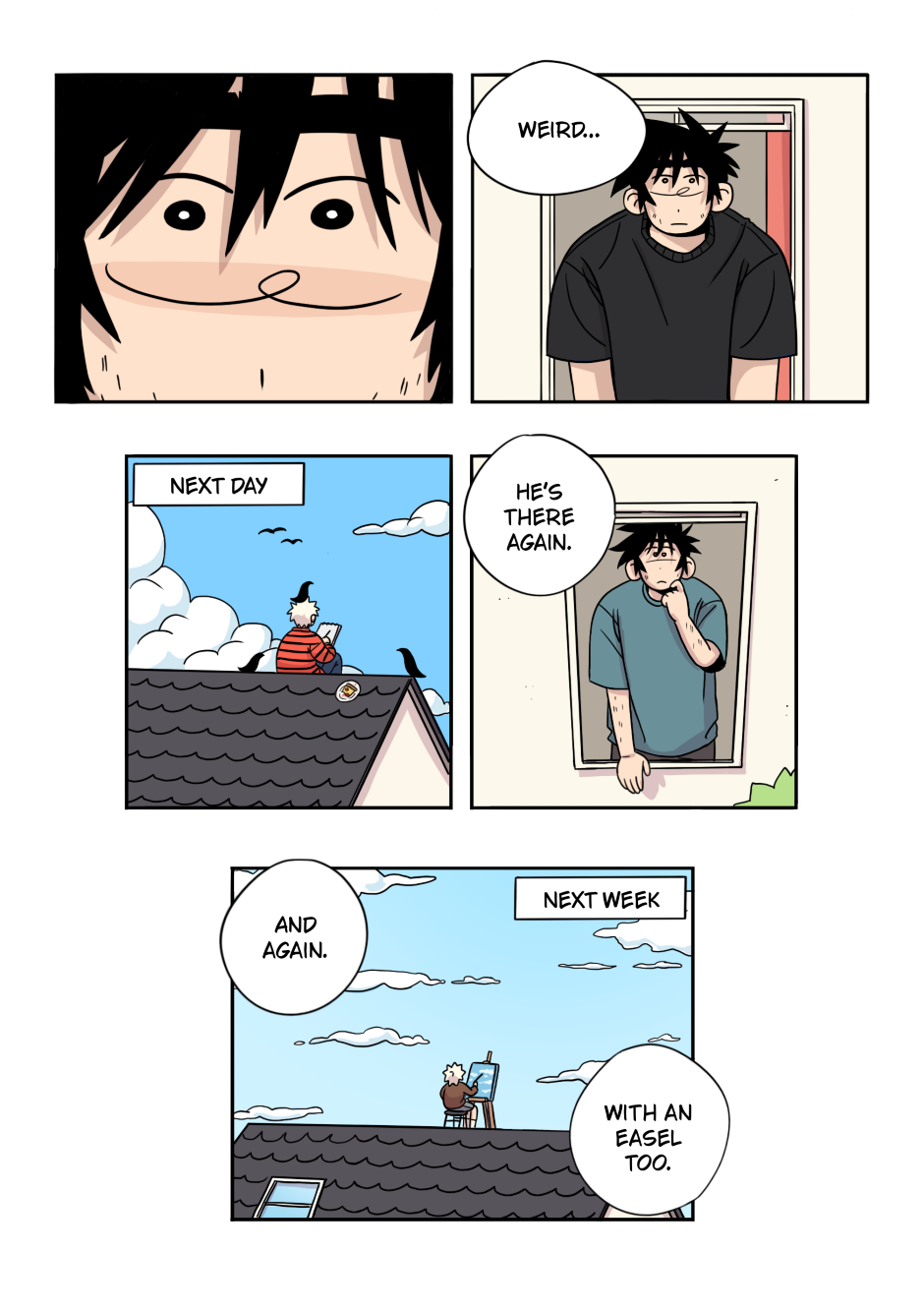 Philip's life changed drastically after his family moved to another country. The separation from his friends and longing for home lead him to deep melancholy and reflection. But into his seemingly joyless life comes a mysterious neighbor who paints on the roof of his house every morning