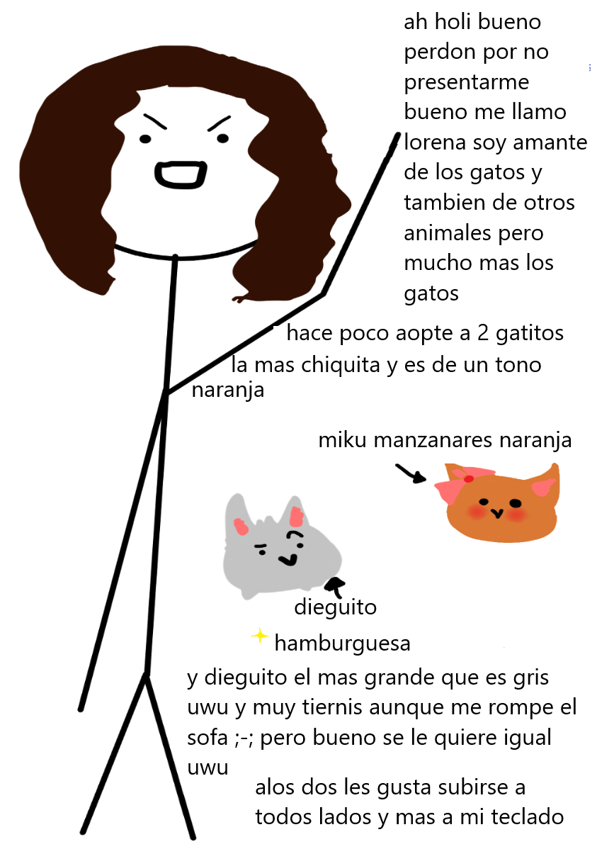 una chica que adopta 2 gatos vamos a ver mucha aventuras que pasan del lado de los gatitos pero tambien de la chica lorena :D que pasara?los gatos se iran a comprar cigarrillos? xd leelo y descubrelo uwu