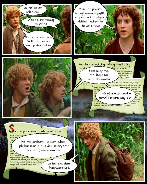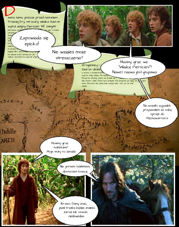 "Władca Pierścieni" jest jednym z filarów nowoczesnego D&D [komiks powstał w roku 2006-ym - Aure]. Choć gra wyrosła z powieści, po latach tak bardzo oddaliła się od źródła, że próba ponownego połączenia obu tych nurtów byłaby szaleństwem. Wyobraźcie sobie, że grupa fanów hack-n-slash jakimś cudem zupełnie nie znałaby świata stworzongo przez Tolkiena, a poznać by go miała akurat poprzez kampanię D&D."