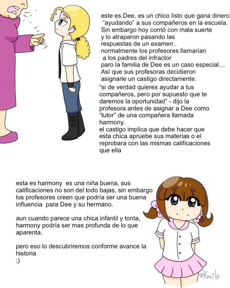 Dee es un chico listo que gana dinero vendiéndole las respuestas de sus exámenes a sus compañeros, hasta que sus profesoras lo atrapan y lo castigan obligándolo a volverse el tutor de su compañera Harmony , la chica en si no es mala en la escuela pero a ojos de los profesores podría ser una buena influencia para Dee . FANCOMIC basado en la serie animada METAL FAMILY creada por ALINA KOVALEVA dee, heavy,glam, Victoria,lydia ,ana y ches no me perteneces son propiedad de la creadora de metal family