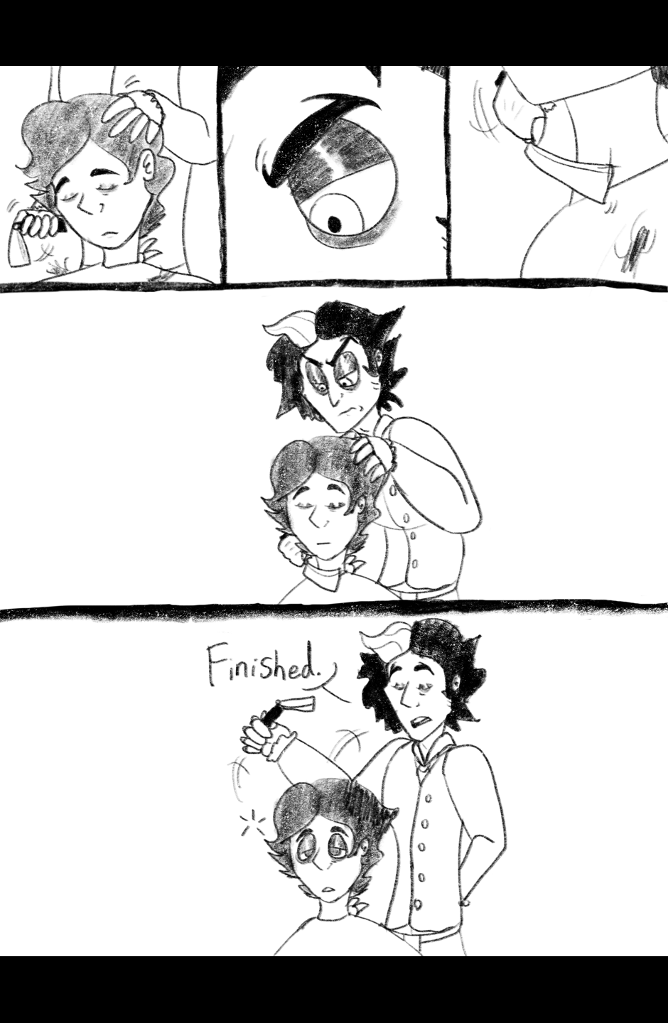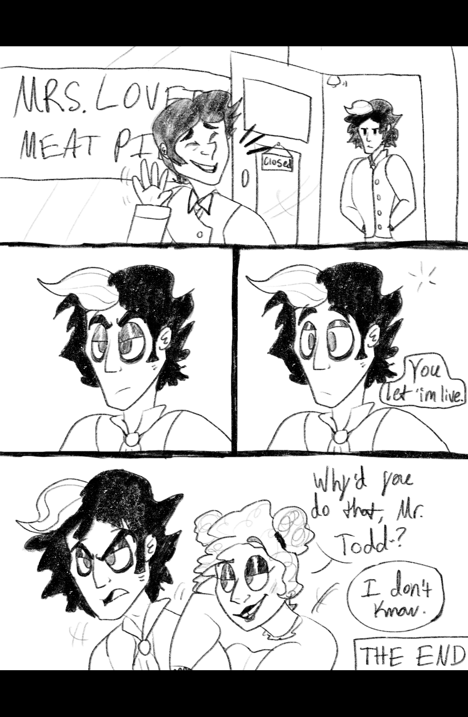 The meeting of two men, mad with vengeance... A Sweeney Todd self ship mini comic I started at 2 AM in the middle of May. The self insert/OC's name is Henry Finch (he/him)! To be continued?