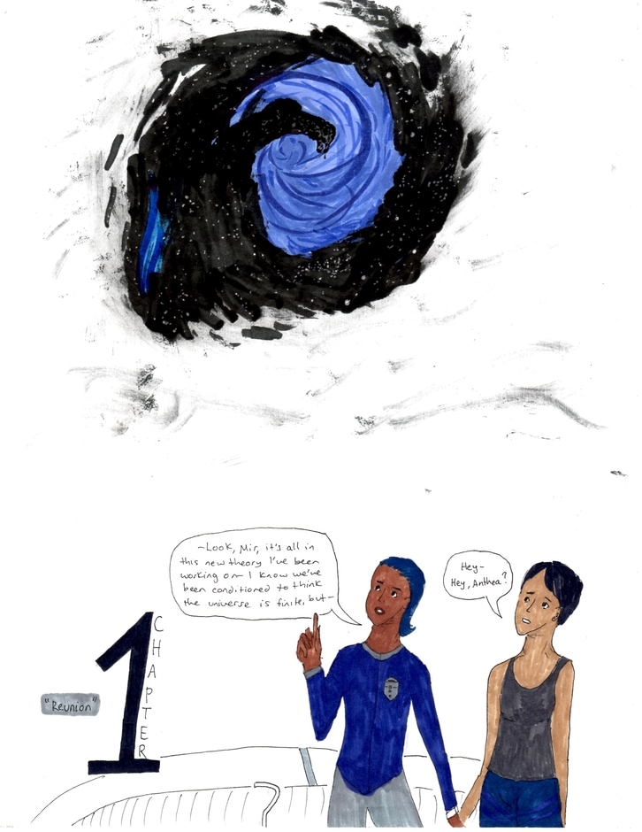 First page released! Enjoy, and feel free to comment. - TRANSCRIPT Chapter 1: “Reunion” Anthea: Look, Mir, it’s all in this new theory I’ve been working on—I know we’ve been conditioned to think the universe is finite, but— Mirren: Hey—Hey, Anthea?